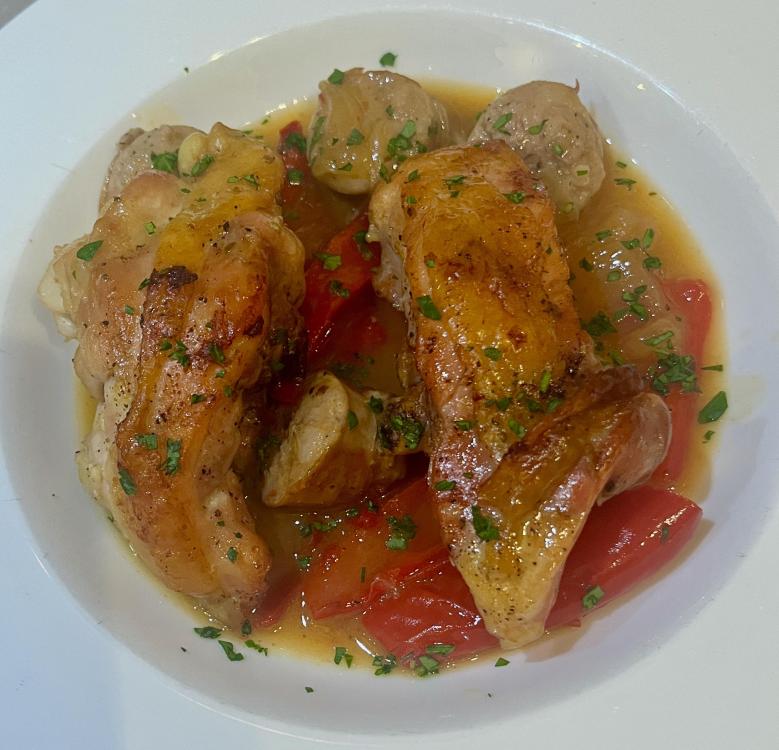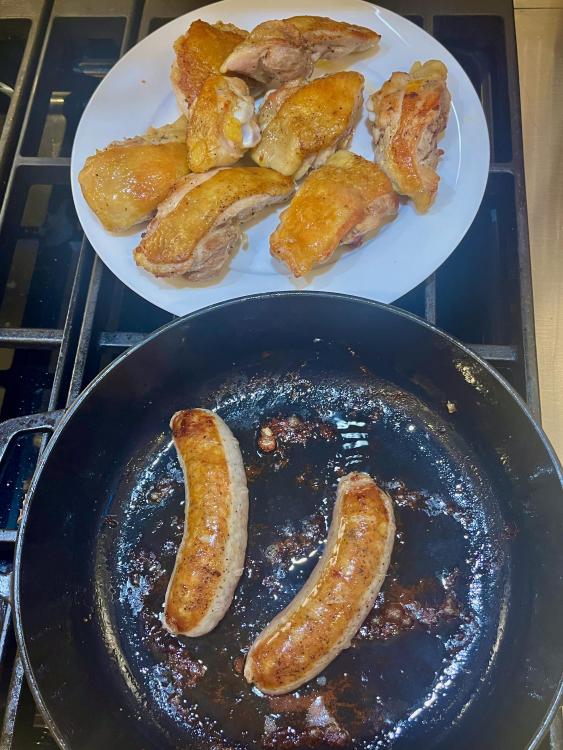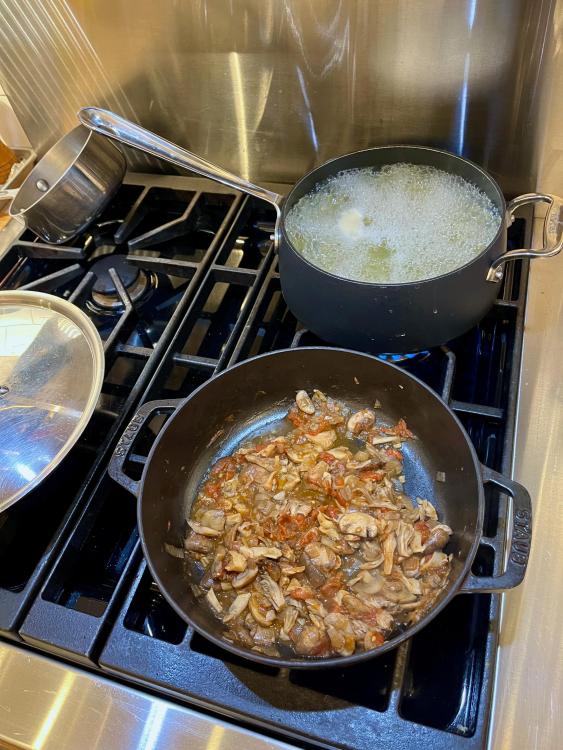 Two nights ago: Started with perfect Manhattans. This became penne with assorted mushrooms ( a la Marcella). Last night: A great version of Chicken Scarpariello, using Kenji's method of finishing the dish in the oven, uncovered, for 30 minutes. The chicken cooks through, while the skin becomes nice and crisp, as it cooks above the liquid below. A couple of caveats to Kenji's method: 1. There's no way this is a quick, easy, Tuesday night meal. I actually used chicken thighs which I had cut in half, salted, and rested in the refrigerator over 2 nights. Sure, you don't have to do that part, but it makes the dish measurably better. 2. There's no way I'd use 8 hot cherry peppers. The cherry peppers I get are really hot; 8 would make the dish inedible, in my opinion. Although I suppose you could use sweet cherry peppers, for a different version. Otherwise, go to town.