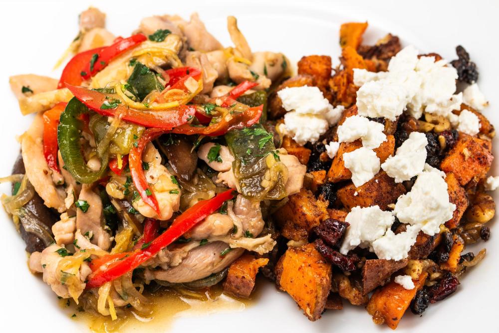 Ginger chicken: Saute sliced chicken thigh meat with garlic, then mix in sliced onion, slivered ginger, oyster sauce, fish sauce, white pepper, sugar, sliced Shiitake mushrooms, and a mix of sliced peppers (red bell, roasted Poblano, and Cubanelle). Finished with cilantro. Mrs. C made a sweet potato salad with pecans, dried cranberries, dried black currants, feta cheese, and a champagne vinegar dressing.