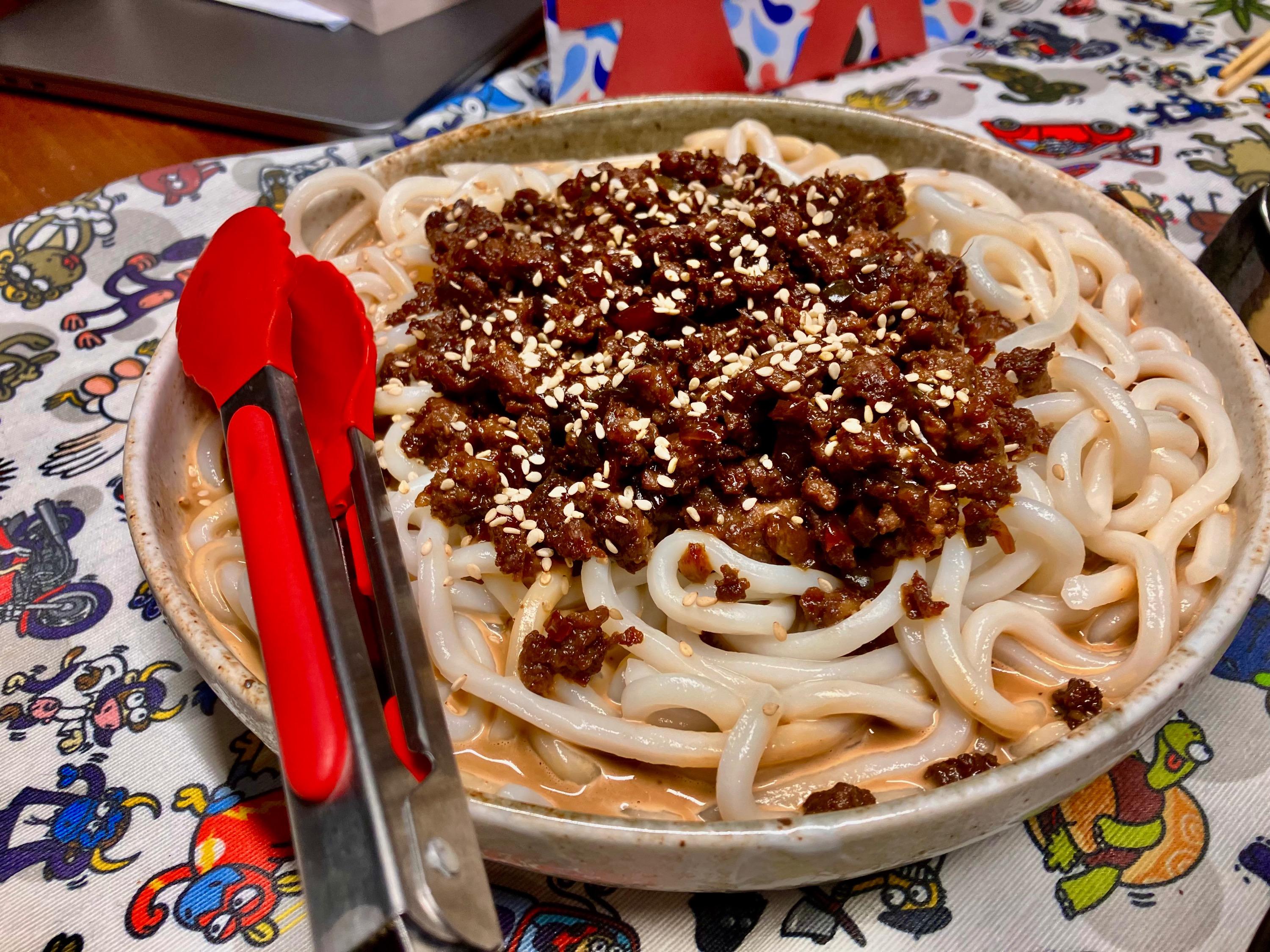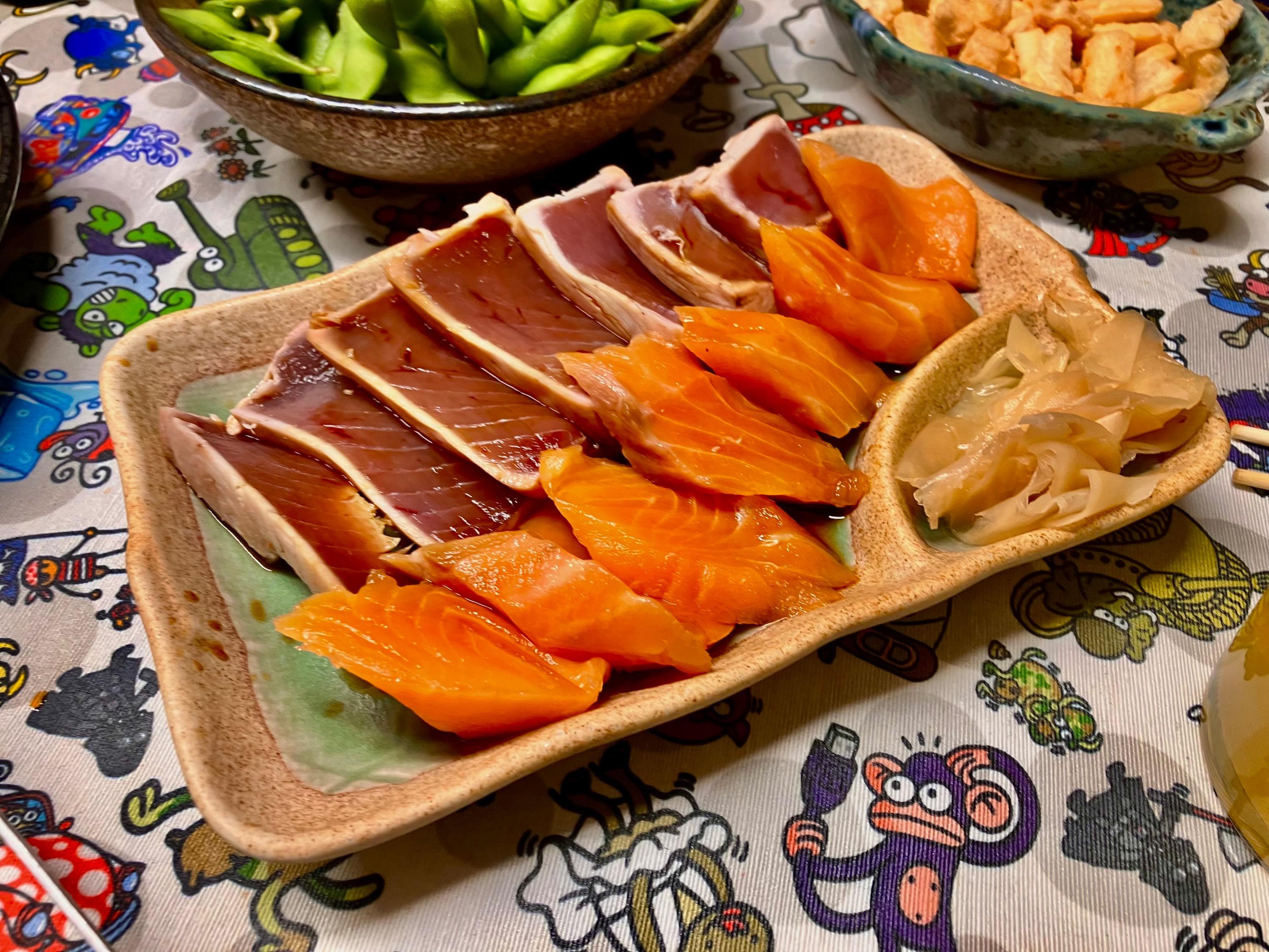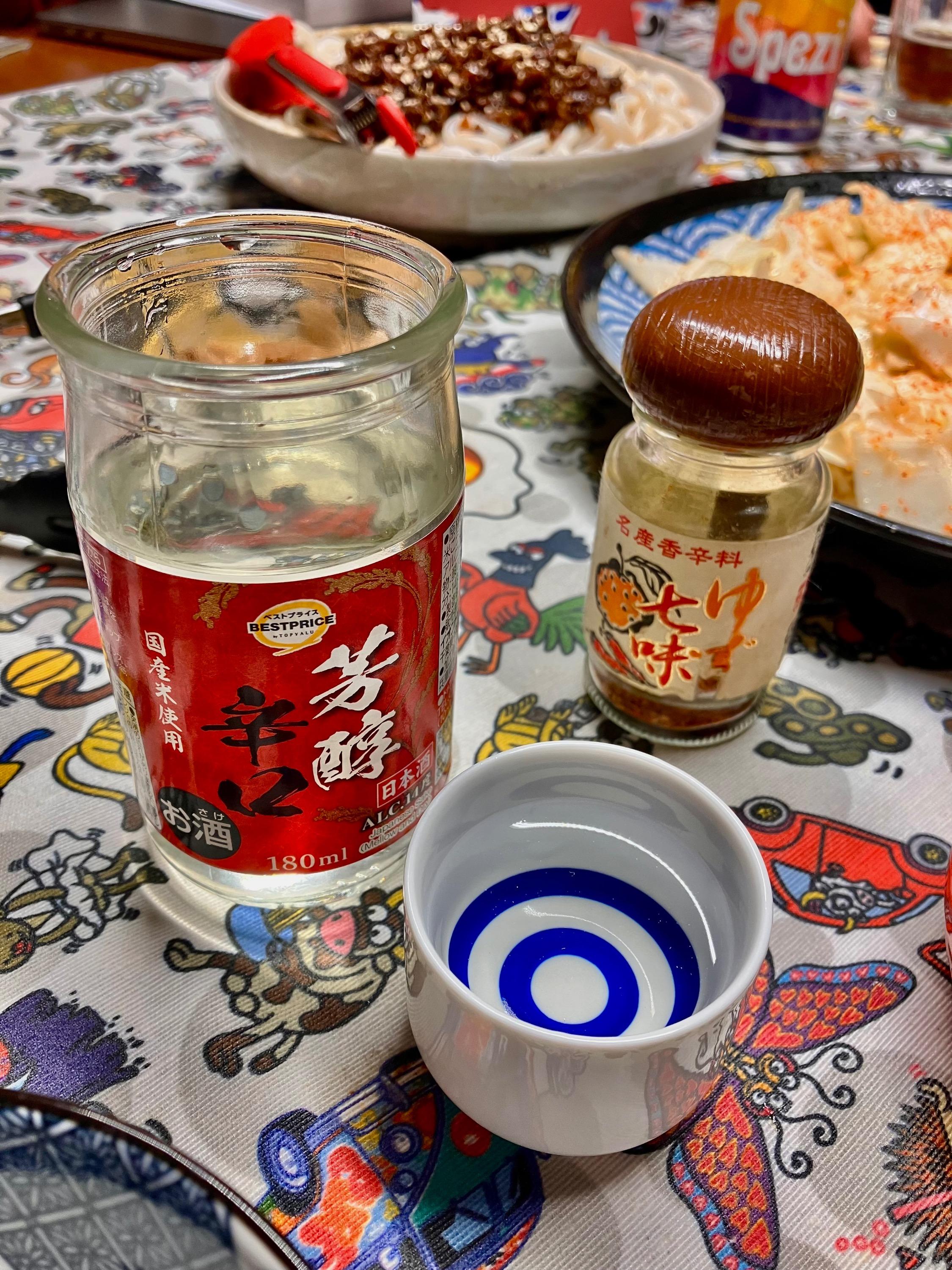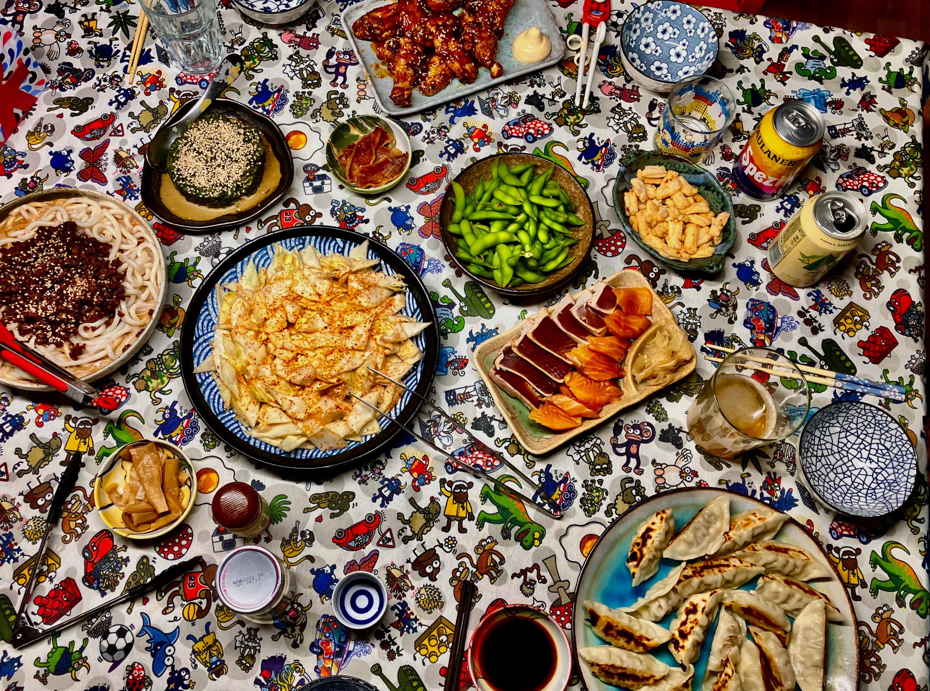 Little one had a friend over, who stayed for dinner. I offered hot docs; little one requested gyoza. Soooo … Japanese diinner: I picked some dried hoya (sea pineapple) a snack. The perfect accompaniment to sake .. I am not sure if I ever mentioned tgat beside housing my whiskey collection and my cookbooks, the mancave is also home to a rather extensive collection of one cup sakes ? Tonights treat … And foodwise … rice crackers: Excellent menma … Gyoza: Ajinomotos pork one. Simply no comparison 🙏 Tuna tataki & salmon sashimi ..: Chicken tebasaki … Yamitsuki cabbage … Soinach with black miso-sesame dressing … And Dan Dan Udon … And for dessert: Melty kiss … very melty, very good ! No complaints 🤗