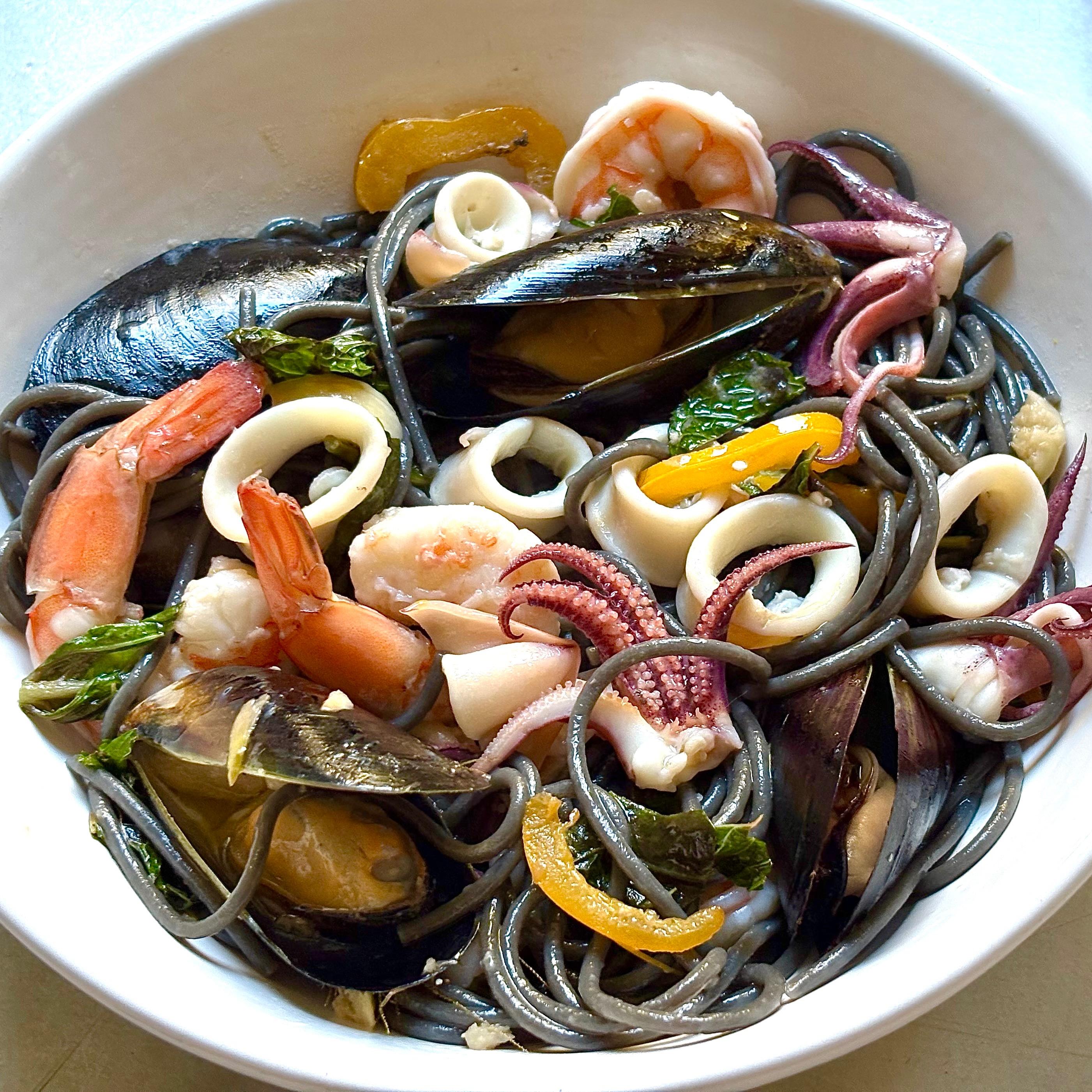 Hot chiles with shrimp, mussels, squid, basil, and mint on squid ink pasta from Six Seasons of Pasta. I love the garlicky, lemony, winey sauce, kicked up with the fresh hot chile but ultimately, fishing mussels and larger shrimp out of a dish of pasta is awkward. I made this with squid ink pasta, manzano chiles and shrimp that were big enough to need cutting up. My fault on the shrimp size but unlike the mussels and squid, they didn’t add a lot to the dish. I’d make this again with the mussels & squid but take the mussels out of the shells before serving.