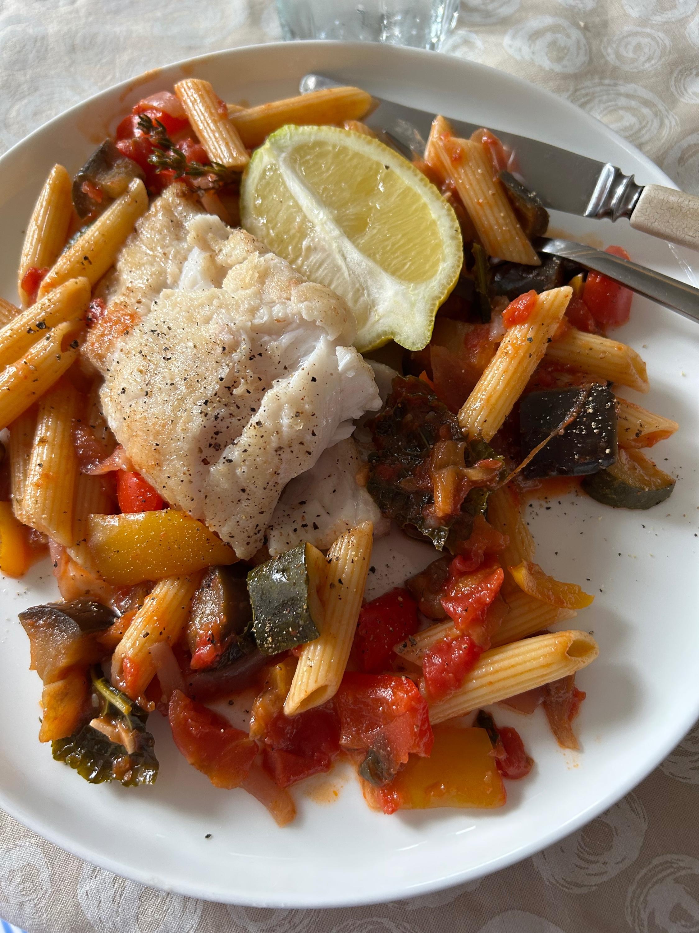 @Honkman your dinner of creamy saffron orzo with garlic butter shrimps sounds and looks delicious. We had fish, lightly fried in dusting of seasoned flour …rockling an Australian meaty white fish. As a side there was ratatouille combined with penne pasta.