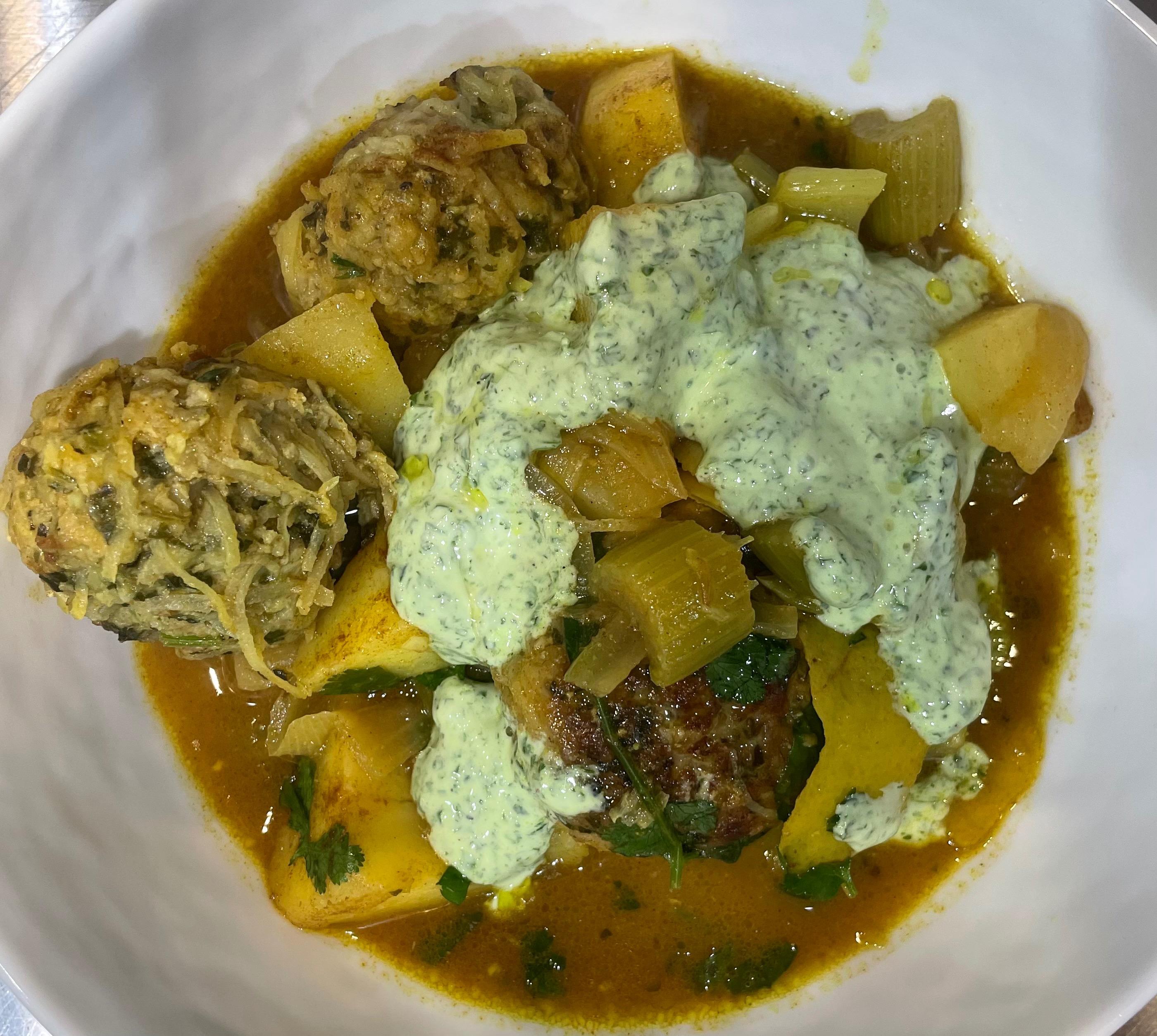 Chicken Meatballs, Potatoes, and Lemon from “Comfort” by Ottolenghi - the chicken meatballs are made with ground chicken, mint, scallions, cilantro, garlic, egg, grated potatoes, panko breadcrumbs and cumin. Pan-seared and than braised with potatoes, celery, onions, garlic, turmeric, cumin, cinnamon and sugar in chicken broth. Finished with some cilantro and served with yoghurt sauce (yoghurt, mint and cilantro) and some olive oil