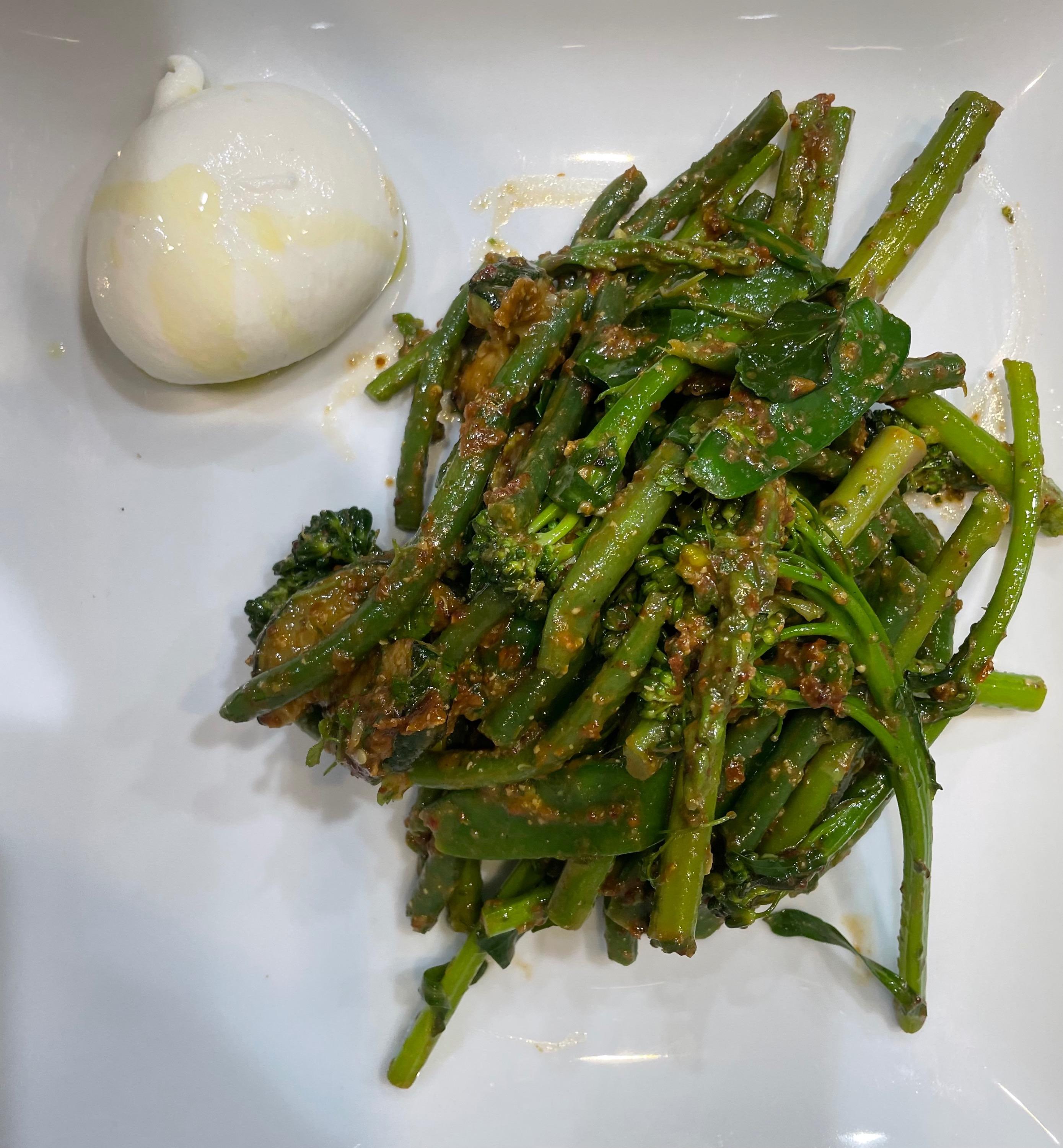 “Green” Salad with Tomato Dressing and Burrata based on a recipe from essen & trinken magazine - the salad has blanched green beans, green asparagus and snow peas, pan-seared zucchini and broccolini, radishes and chervil. The dressing is made by pureeing dried tomatoes, garlic, basil, mustard, smoked paprika, orange juice, olive oil and champagne vinegar. Served with burrata drizzled with olive oil