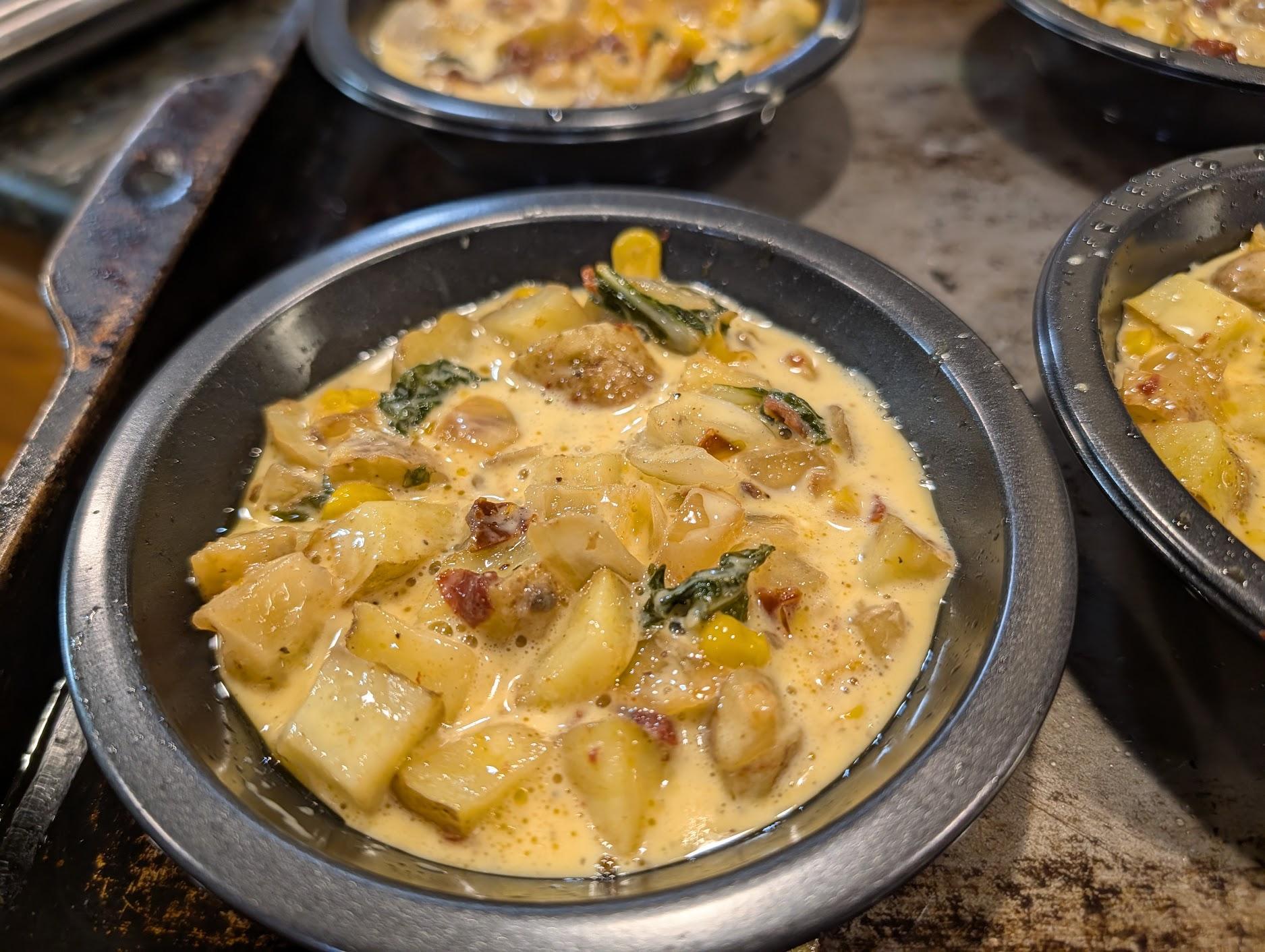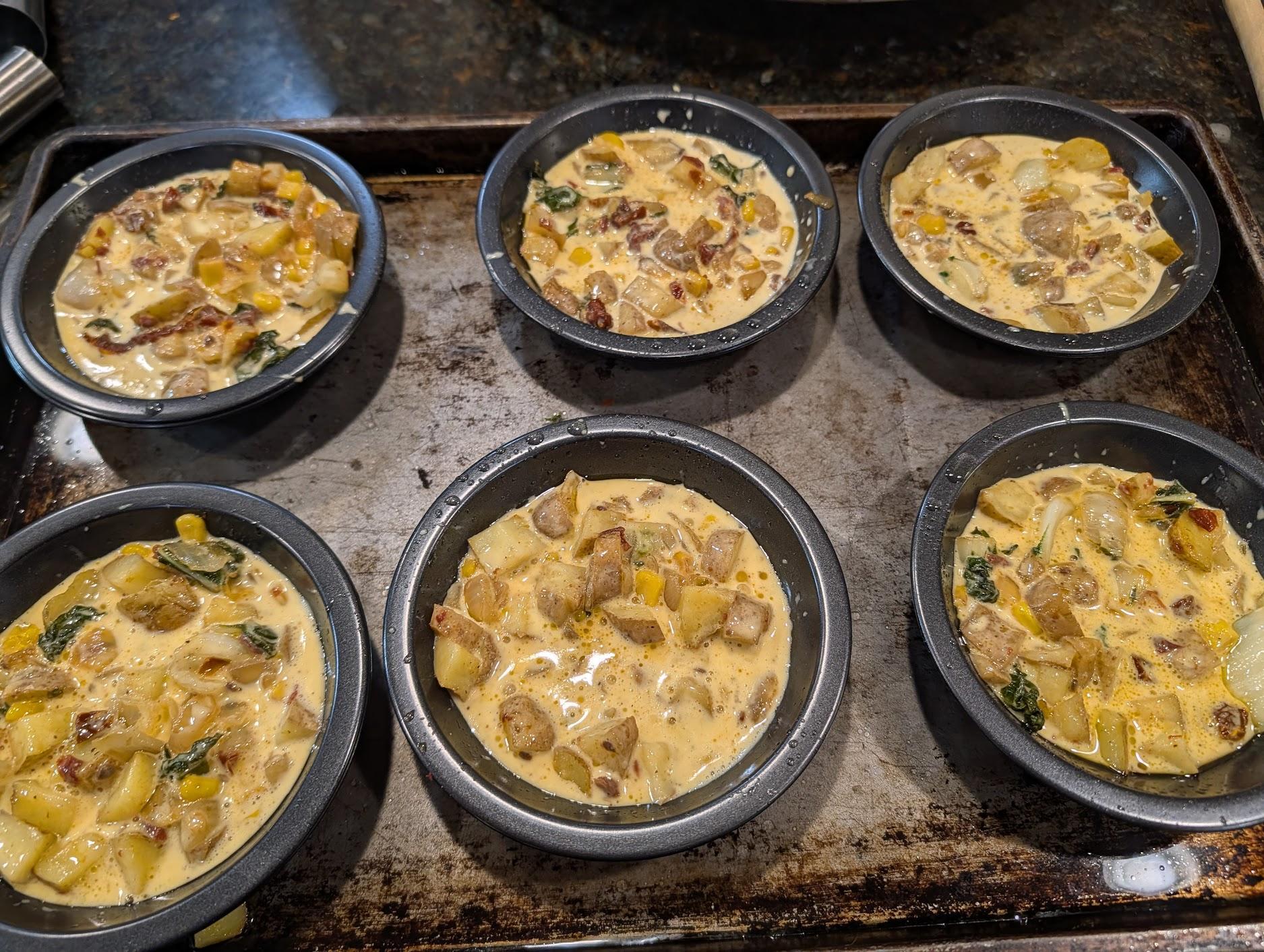 Hand held egg souffle bites== Fingerling potatoes/sundried tomatoes/bckchoy/corn/garlic and 3 yr age gouda cheese