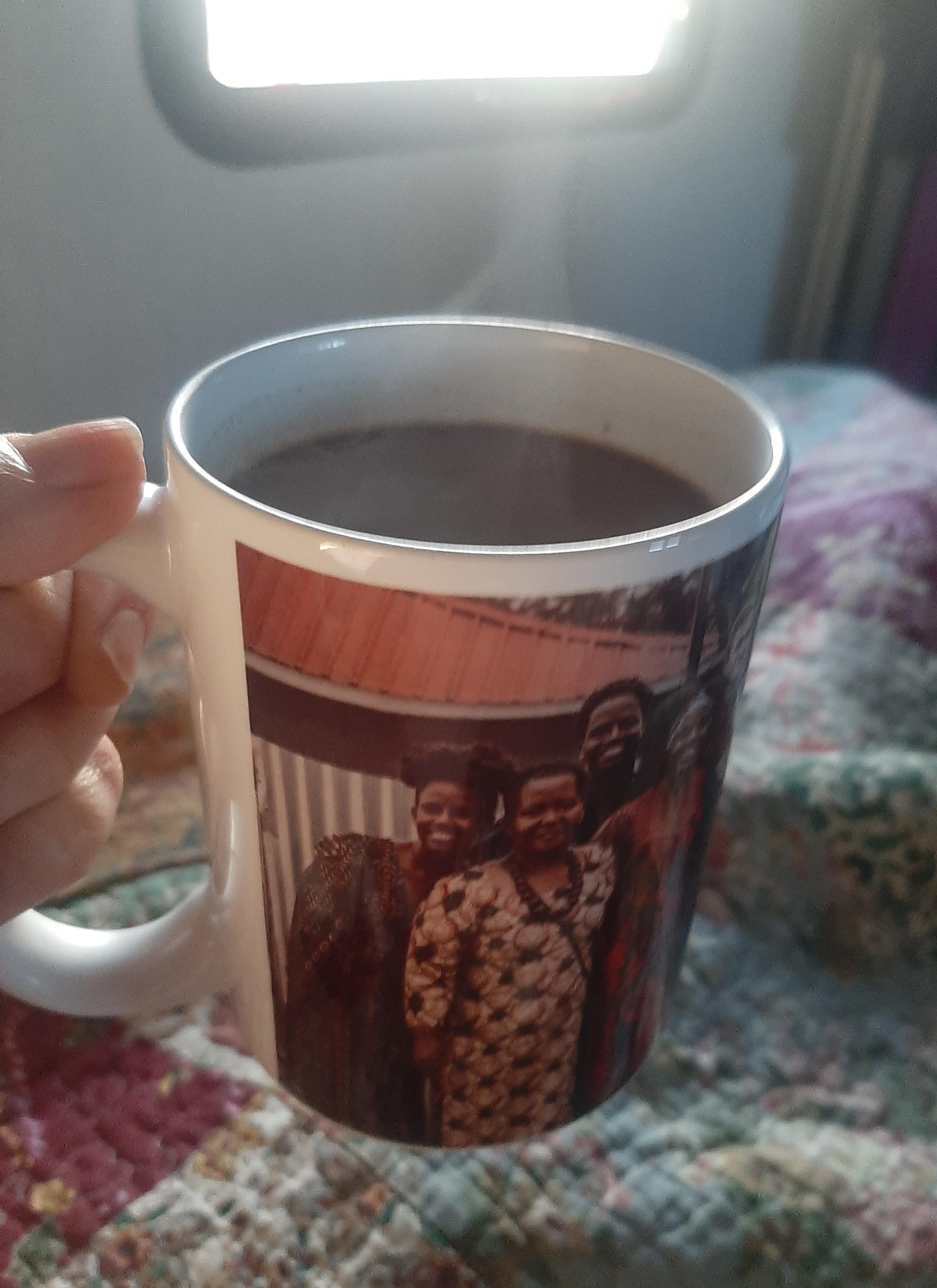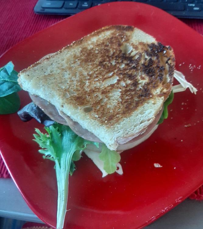 I'm out of the cold country! It took about 9 hours of driving against or across a stiff wind yesterday, and learning what that feels like (and what it does to fuel mileage) but I'm settled for a few days where I can get ready for "regular" camping -- that is, self-contained boondocking, I hope, or at least being able to use my own water. Today I flushed the lines of antifreeze, to the best of my ability, and filled the water tank. The water is still fizzy and vaguely pink, and not especially pleasant to drink, so i'll continue using bottled water until it's all flushed below my personal detection limit. This was yet one more reason my darling always wanted to be gone by now: I really detested the lingering taste of RV antifreeze, so when we bought a new trailer we ensured that the stuff had never contaminated the pipes. But that meant, of course, that we had to leave before the temperatures dropped below freezing. (One year we did have a severe cold drop in October, so we winterized that Princessmobile that year. It was only for a couple of weeks, and I don't recall having objectionable flavors. Holding time is probably a factor; this Princessmobile was winterized several months ago.) I luxuriated this morning in the idea that I could have my OWN coffee (once I found the stuff) and didn't have to go anywhere in particular. Sunshine outside, steamy coffee in bed! Yay! The coffee mug has a wedding photo from my best friend's youngest son's wedding in Kenya last summer. I'm farther around in the photo, next to my best friend and the happy couple; I'm "Auntie Nancy" to the gang. I've never written here about the Kenyan food I sampled, but you may see some of it later this winter. It was delicious. There's a prairie dog town across the field. I finally know what those mystery "birds" are that chirp so peculiarly from the ground. 🙂 I'll need to go to town tomorrow for fuel and, believe it or not, a few groceries. I finished off the yogurt today, and I think there are other things on the list as well. I worked hard getting the Princessmobile ready (mostly) and waited far too long for lunch; it became dinner. Still, I had a chance to try out my new cast iron griddle atop the stove. I haven't had much luck cooking grilled cheese sandwiches on cast iron at home without smoking up the kitchen, and that's why I almost brought along my panini press. Today's trial worked pretty well, though, Salami, turkey, Havarti cheese (I'm out of the other sliced stuff), mayo, mustard, on sourdough bread. I'd already had an uncooked version of this sandwich. As much as I like that bread's flavor it's a bit too soft without being toasted or griddled. This worked out much better. Butter on the outside for the griddling. Salad greens and pickles added after griddling. It isn't the "ooh, what will I cook first when I have time?" dinner I'd envisioned, but it's all I had the energy for.