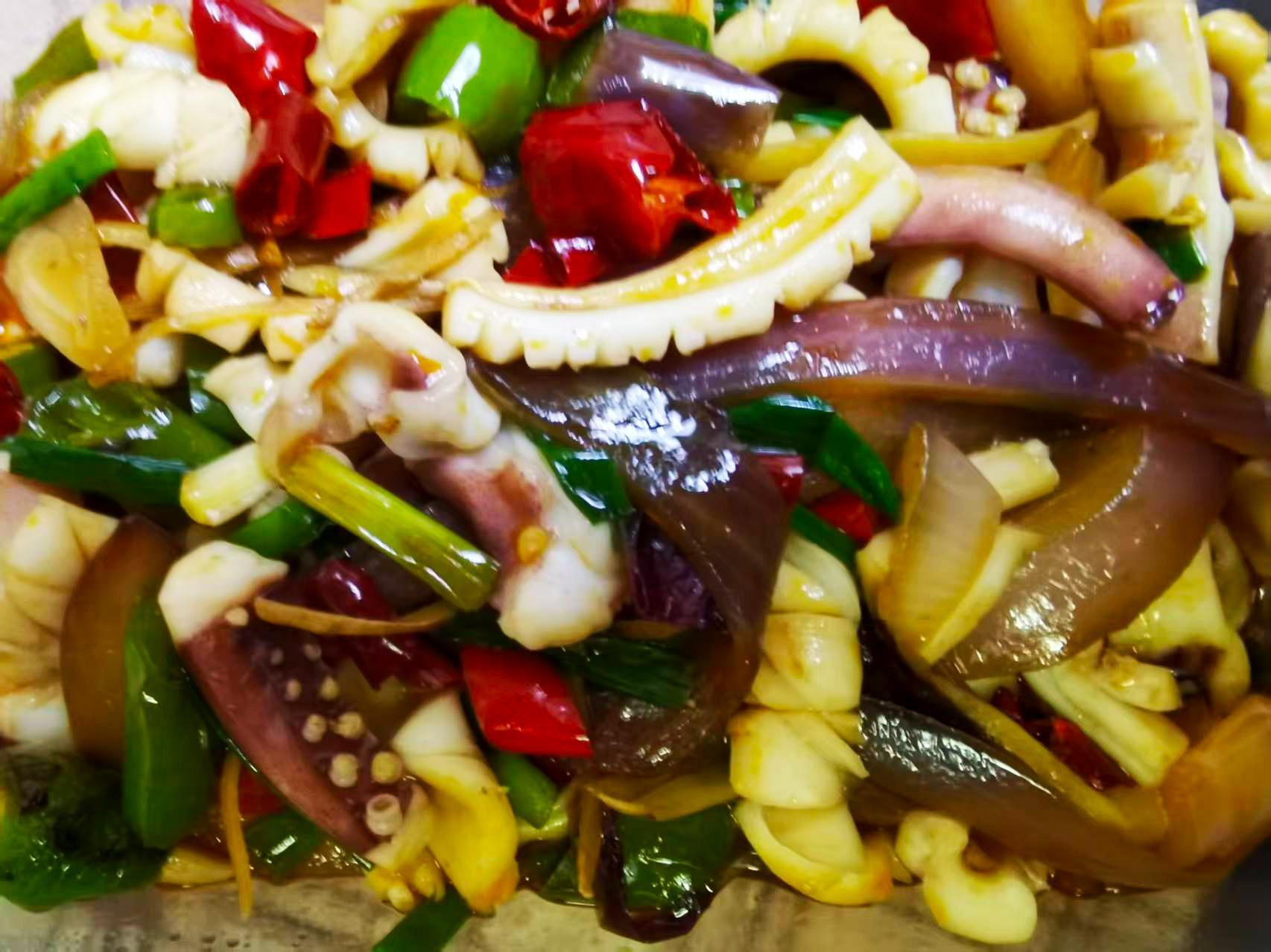 Hunan style squid with red and green chilli, onion, garlic scapes, black vinegar, Shaoxing wine. Served with rice.