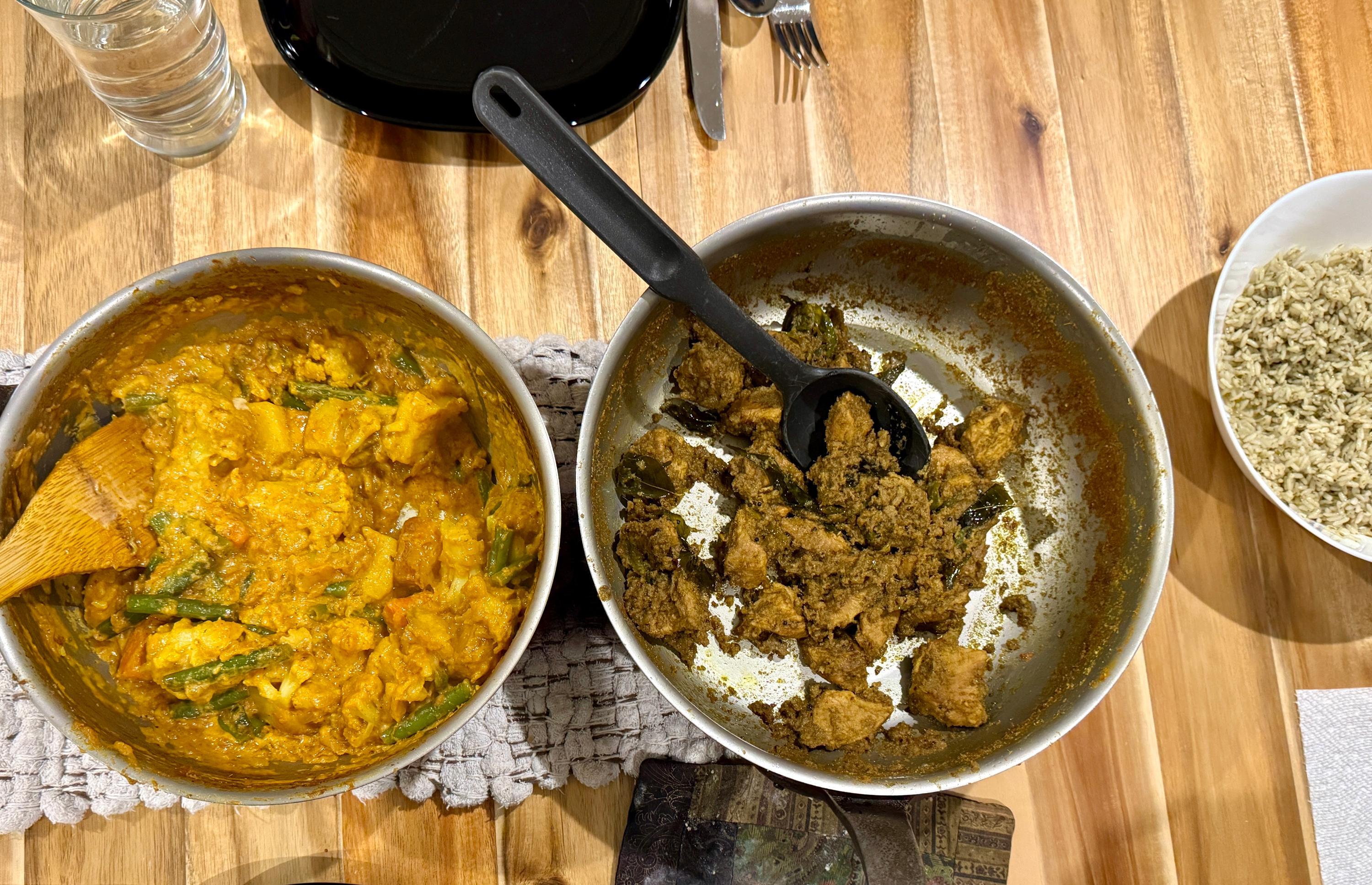 A friend came over for dinner and I cooked a couple of South Indian dishes from 'Curry Cuisine' Kerala lamb: This was interesting in two ways. First, it was prepared like a Malaysian rendang - starts like a stew but the liquid cooks down to a spicy, aromatic glaze. Second, it contains a spice paste of grated coconut, sliced ginger, minced garlic, curry leaves, bay leaves, canela, cloves, and black pepper, all dry-roasted until the coconut browns. Other ingredients included shallots, ground coriander seed, cayenne, and turmeric, and a tadka of mustard seed, more curry leaves, and sliced chiles, quickly seared in hot oil. Mixed vegetable curry (rasa kayi): Carrots, potatoes, green beans, and cauliflower with lots of minced onion and sliced serrano chiles, flavored with ground coriander seed, cayenne, and turmeric, plus a spice paste of garlic, ginger, serrano chile, crushed tomato, and fennel seed. When everything is cooked swirl in coconut milk for richness. Very popular. Microwave cilantro rice to go with.