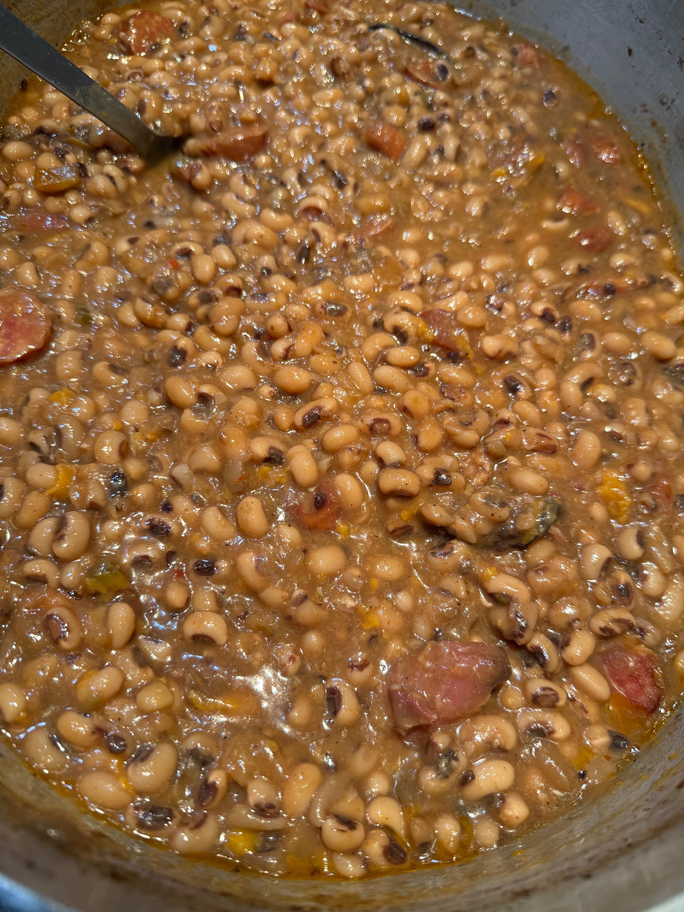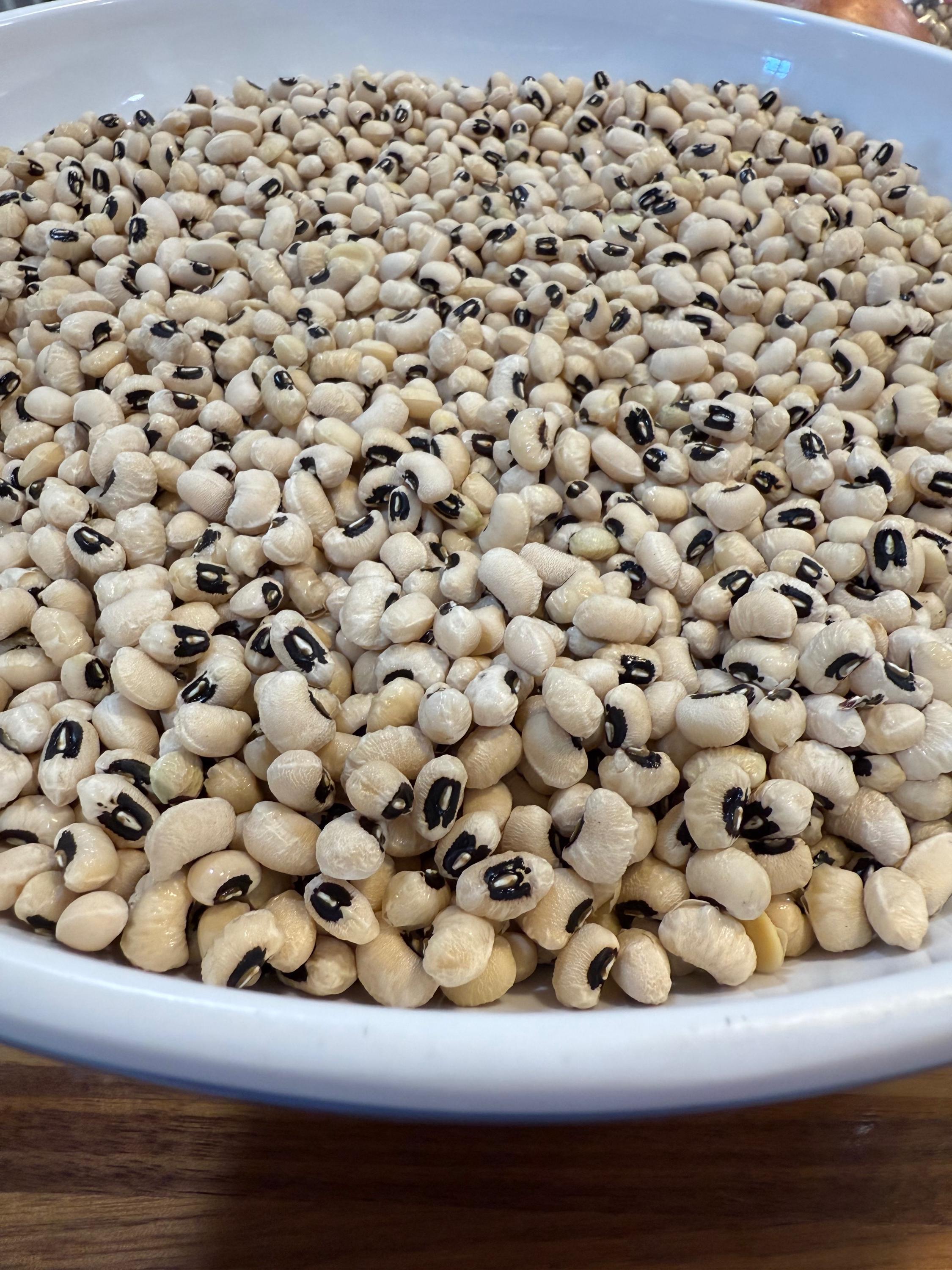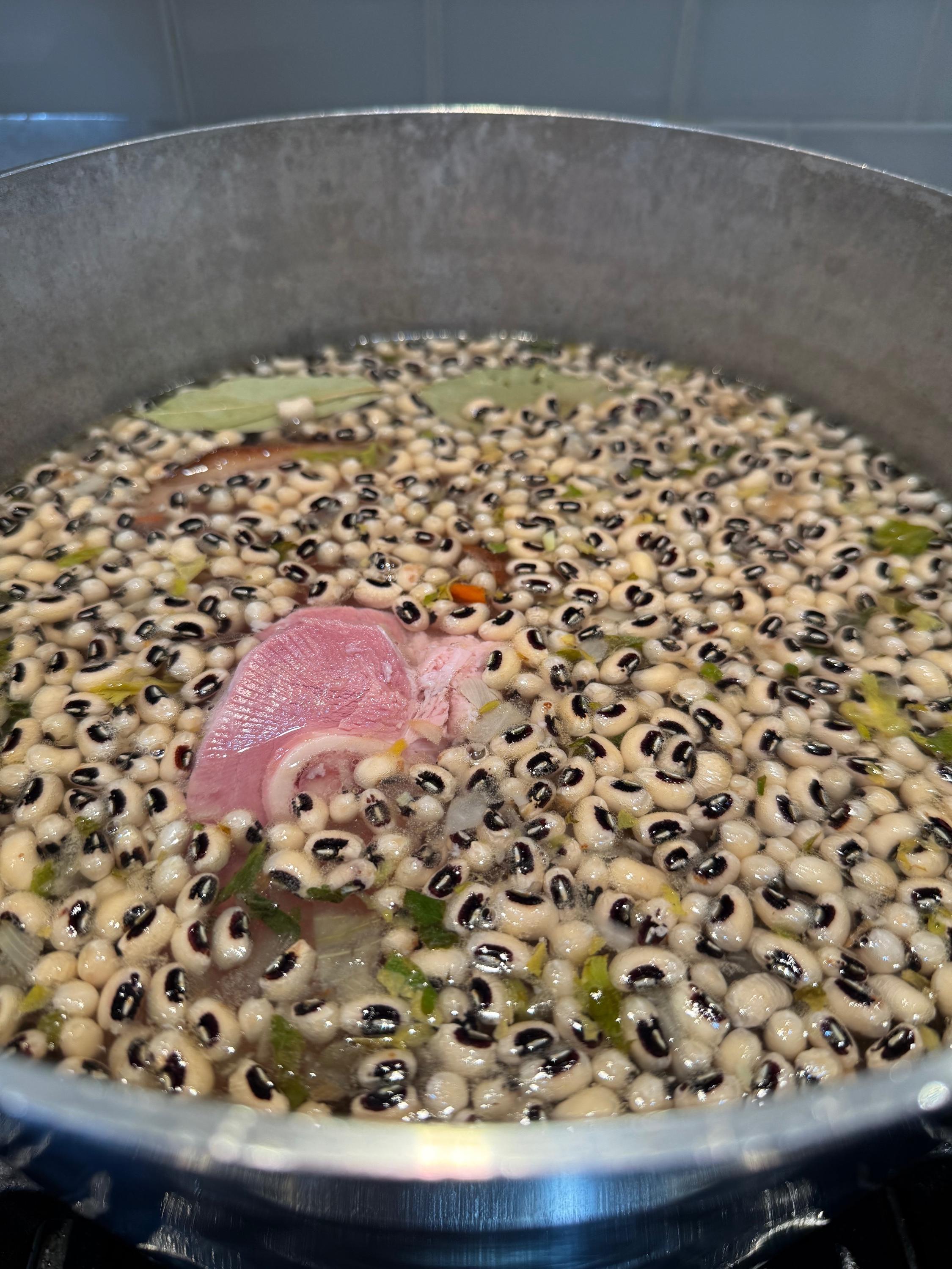 🎵 Let’s start at the very beginning. A very good place to start. 🎵 As previously posted, a generous eGullet member donated a variety box of Rancho Gordo beans to be used in community fridge meals. That box included two packages of black eyed peas, which southerners believe symbolize coins and abundance. Usually served with some type of greens (money) and cornbread (gold). Prosperity and good fortune for the coming year! Because my goal is to make 24 meals of generous portion sizes (and my neurotic desire to make sure there is “enough”), I decided to also cook 2 more pounds of peas, using the local favorite brand, Camellia. Also, my husband wanted to be sure there was enough for his own New Year’s Day meal! I found out just last week that you can buy ham bones from the Honey Baked Ham store when they are available. They were available, and I bought two, at $5.99 each. I consider it a bargain because there really was a good amount of ham attached. A ham for each pot of beans. First things first. Rinsing and sorting. There is often debate about whether or not to soak the beans, and if you do, for how long? I decided against soaking for two reasons. First, I wanted the longer cooking time to make sure the ham bone had time to do its job. B, Rancho Gordo black eyed pea package instructions did not include soaking! Who am I to argue (this time)? It’s probably because they are thin skinned, comme moi. So. After the rinsing and sorting, aromatics were sautéed in bacon grease from my bacon grease crock. The RG peas were cooked in an 8 quart stock pot, while the Camellias were cooked in a larger roaster. Instead of choosing pots for their usual function, I have to choose by size. My largest Dutch oven is 7 1/4 quarts, but I have larger roasters and stock pots. Two pounds of beans or peas needs at least an 8 quart pot. After the veg was sautéed, the ham bone, rinsed and sorted black eyes, and a few bay leaves were added to the pot, along with enough water to cover the beans by an inch or so. Pot 1 Pot 2 And eventually: Pot 1 Pot 2 At some point between those pics, smoked sausage, seasoning, and a couple of tablespoons of tomato paste were added. I didn’t add salt early in the cooking, according to package directions. But the ham added salt, so I don’t know if that is theoretically a bad thing or not. Taste wise, it was a good thing! The pot of Rancho Gordo beans had more liquid and it was brothier. I didn’t want to cook the liquid down at the risk of over cooking the peas, and they were done, and tasted delicious! I was very pleased with the result. The Camellias took a little longer to cook, and in the end, were thicker. There were a number of variables at play, but both pots of beans tasted good. While the original plan for the cabbage included tasso, getting the ham changed that. I’d already bought smoked sausage, and decided to use that in both the peas and the cabbage. Here is the beginning of the cabbage prep. I used five heads, and this was one. Fried cabbage usually starts with bacon. This was two pounds. The onions need to fry in the rendered bacon fat. And so did the cabbage. Seasoning included celery seed, salt, black pepper, sugar. A little chicken broth to let it lightly simmer to tenderize some, but I wanted a little bite to it, no mush. For the cornbread, I did my usual 6 packs of Jiffy in a sheet pan, adding some grated cheddar and some pickled jalapeño slices into the mix. The last time I made cornbread for a CFM, the cornbread seemed a little dry. This time I took a stick of butter and rubbed it all over the surface of the cornbread while it was still warm and uncut. I used half a stick of butter over the 24 pieces. It looked purty. No pics of the two rice cookers making rice. I really need to learn how to make rice in the oven in a hotel pan. Note: I usually like to mix the food cooked in separate pots, but I didn’t do that with these. I wanted the flavors of each to show. But about midway, I admit I did start mixing a scoop of the brothier peas with a scoop of the thicker peas. Apologies to the purists. The plated meal: Delivered, about 12:30 pm yesterday. There are only 20 plates in the fridge because a mother and her children took four as we were unloading. Happy New Year!