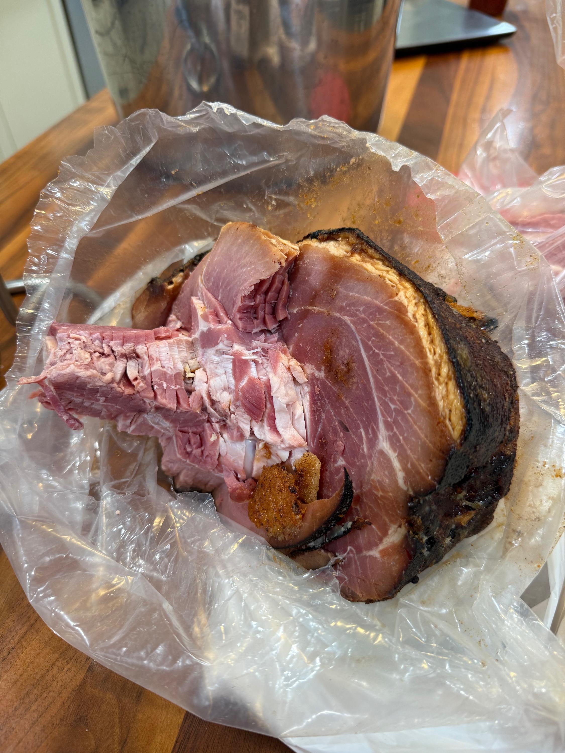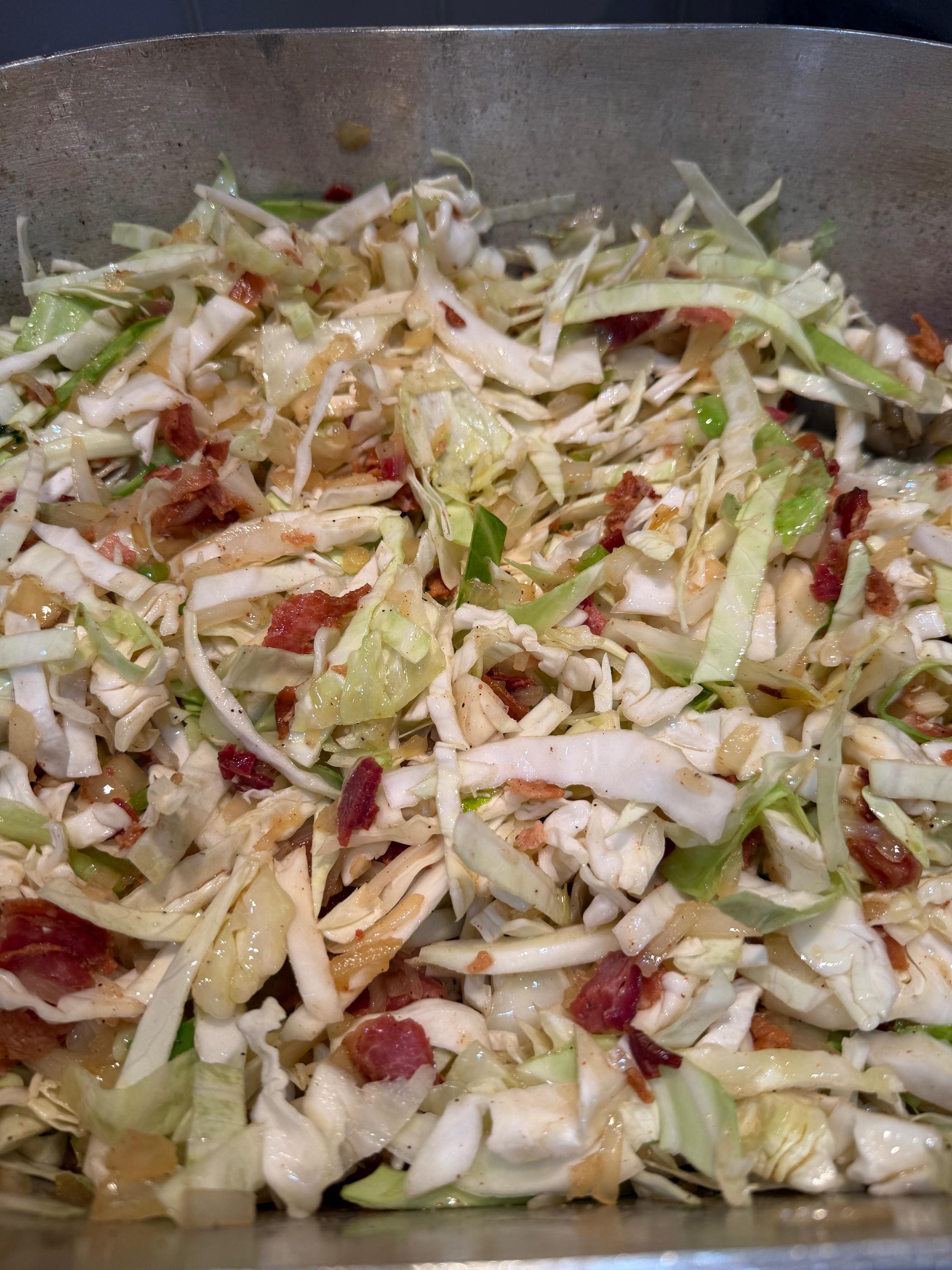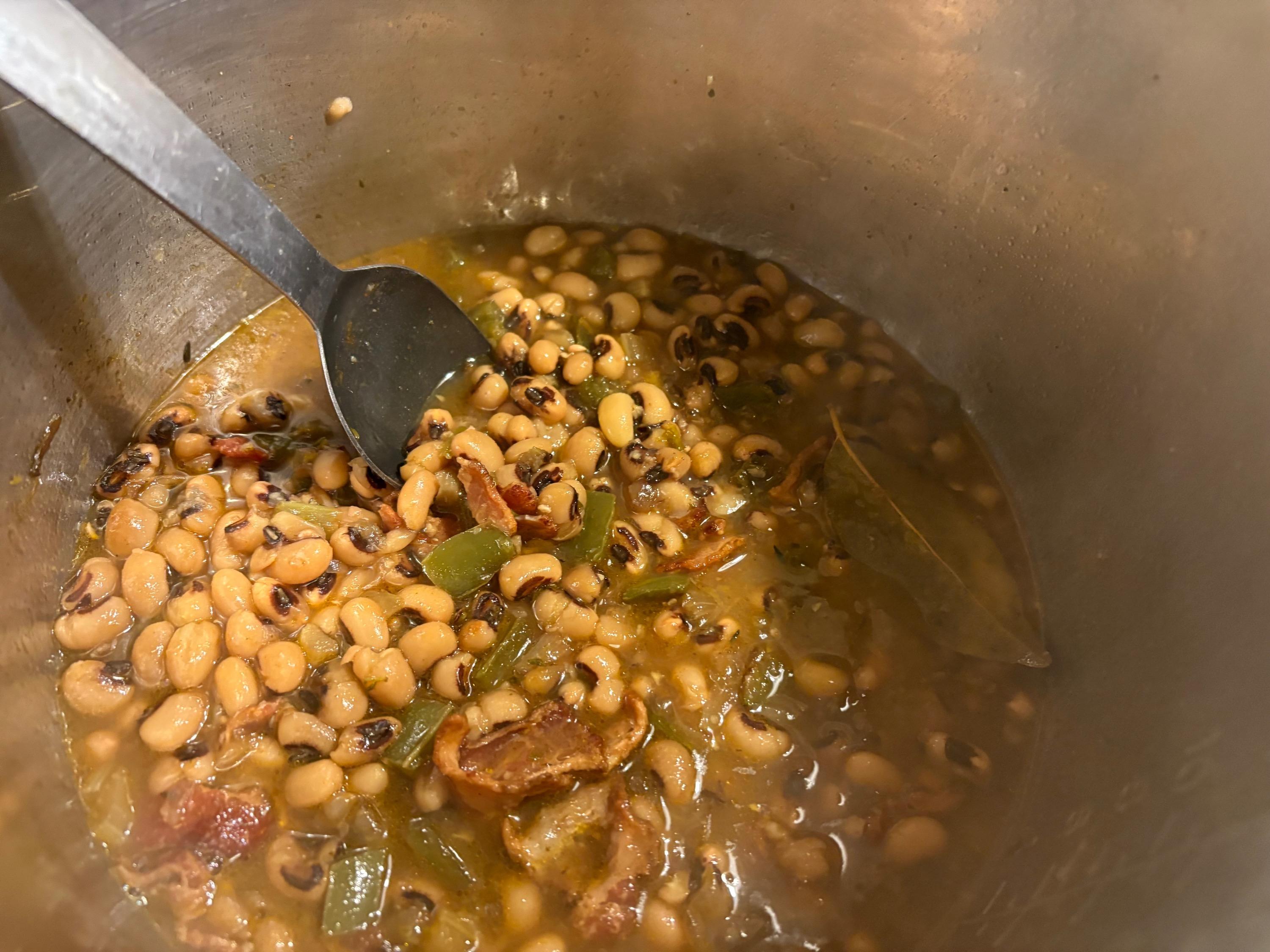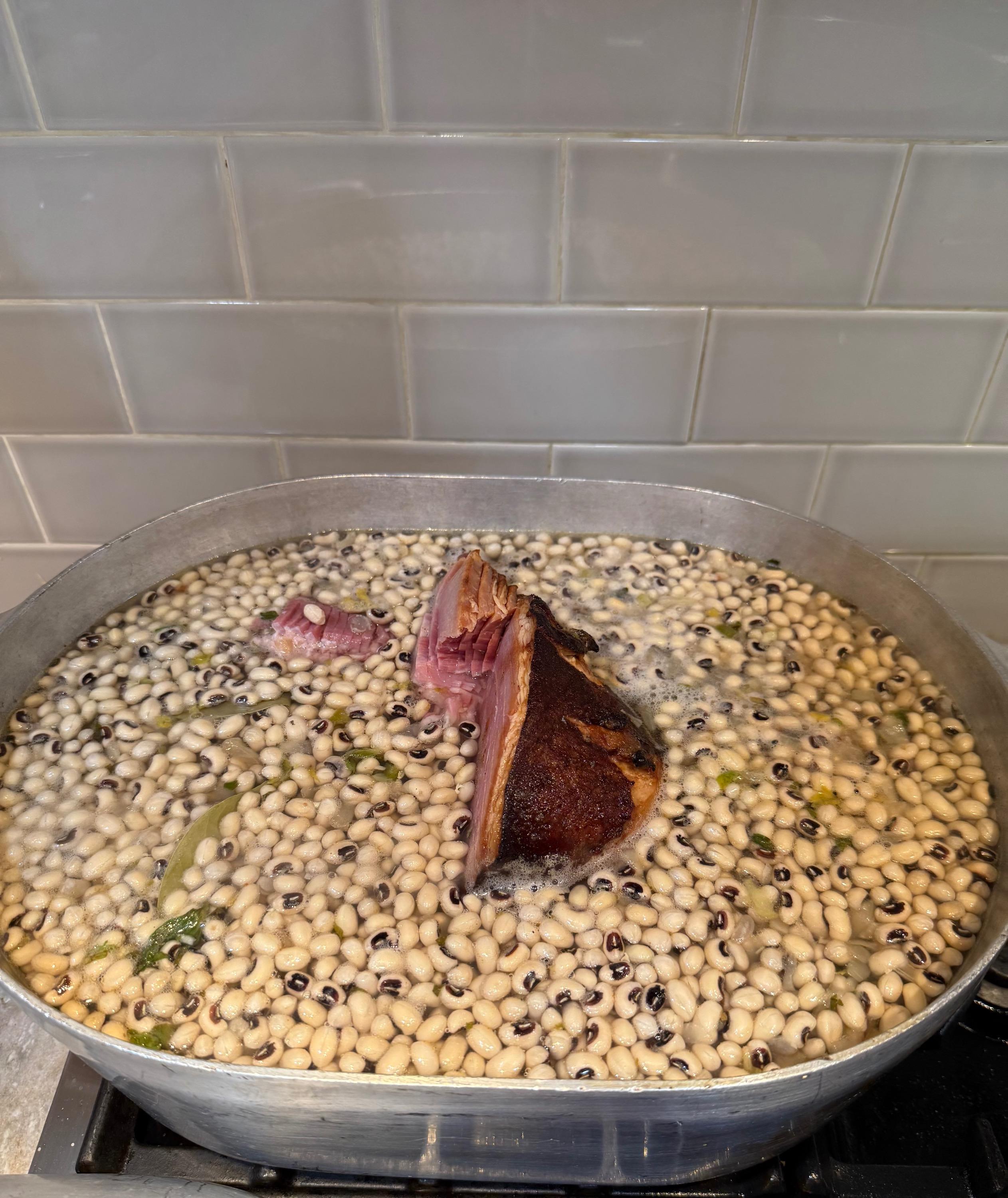 🎵 Let’s start at the very beginning. A very good place to start. 🎵 As previously posted, a generous eGullet member donated a variety box of Rancho Gordo beans to be used in community fridge meals. That box included two packages of black eyed peas, which southerners believe symbolize coins and abundance. Usually served with some type of greens (money) and cornbread (gold). Prosperity and good fortune for the coming year! Because my goal is to make 24 meals of generous portion sizes (and my neurotic desire to make sure there is “enough”), I decided to also cook 2 more pounds of peas, using the local favorite brand, Camellia. Also, my husband wanted to be sure there was enough for his own New Year’s Day meal! I found out just last week that you can buy ham bones from the Honey Baked Ham store when they are available. They were available, and I bought two, at $5.99 each. I consider it a bargain because there really was a good amount of ham attached. A ham for each pot of beans. First things first. Rinsing and sorting. There is often debate about whether or not to soak the beans, and if you do, for how long? I decided against soaking for two reasons. First, I wanted the longer cooking time to make sure the ham bone had time to do its job. B, Rancho Gordo black eyed pea package instructions did not include soaking! Who am I to argue (this time)? It’s probably because they are thin skinned, comme moi. So. After the rinsing and sorting, aromatics were sautéed in bacon grease from my bacon grease crock. The RG peas were cooked in an 8 quart stock pot, while the Camellias were cooked in a larger roaster. Instead of choosing pots for their usual function, I have to choose by size. My largest Dutch oven is 7 1/4 quarts, but I have larger roasters and stock pots. Two pounds of beans or peas needs at least an 8 quart pot. After the veg was sautéed, the ham bone, rinsed and sorted black eyes, and a few bay leaves were added to the pot, along with enough water to cover the beans by an inch or so. Pot 1 Pot 2 And eventually: Pot 1 Pot 2 At some point between those pics, smoked sausage, seasoning, and a couple of tablespoons of tomato paste were added. I didn’t add salt early in the cooking, according to package directions. But the ham added salt, so I don’t know if that is theoretically a bad thing or not. Taste wise, it was a good thing! The pot of Rancho Gordo beans had more liquid and it was brothier. I didn’t want to cook the liquid down at the risk of over cooking the peas, and they were done, and tasted delicious! I was very pleased with the result. The Camellias took a little longer to cook, and in the end, were thicker. There were a number of variables at play, but both pots of beans tasted good. While the original plan for the cabbage included tasso, getting the ham changed that. I’d already bought smoked sausage, and decided to use that in both the peas and the cabbage. Here is the beginning of the cabbage prep. I used five heads, and this was one. Fried cabbage usually starts with bacon. This was two pounds. The onions need to fry in the rendered bacon fat. And so did the cabbage. Seasoning included celery seed, salt, black pepper, sugar. A little chicken broth to let it lightly simmer to tenderize some, but I wanted a little bite to it, no mush. For the cornbread, I did my usual 6 packs of Jiffy in a sheet pan, adding some grated cheddar and some pickled jalapeño slices into the mix. The last time I made cornbread for a CFM, the cornbread seemed a little dry. This time I took a stick of butter and rubbed it all over the surface of the cornbread while it was still warm and uncut. I used half a stick of butter over the 24 pieces. It looked purty. No pics of the two rice cookers making rice. I really need to learn how to make rice in the oven in a hotel pan. Note: I usually like to mix the food cooked in separate pots, but I didn’t do that with these. I wanted the flavors of each to show. But about midway, I admit I did start mixing a scoop of the brothier peas with a scoop of the thicker peas. Apologies to the purists. The plated meal: Delivered, about 12:30 pm yesterday. There are only 20 plates in the fridge because a mother and her children took four as we were unloading. Happy New Year!