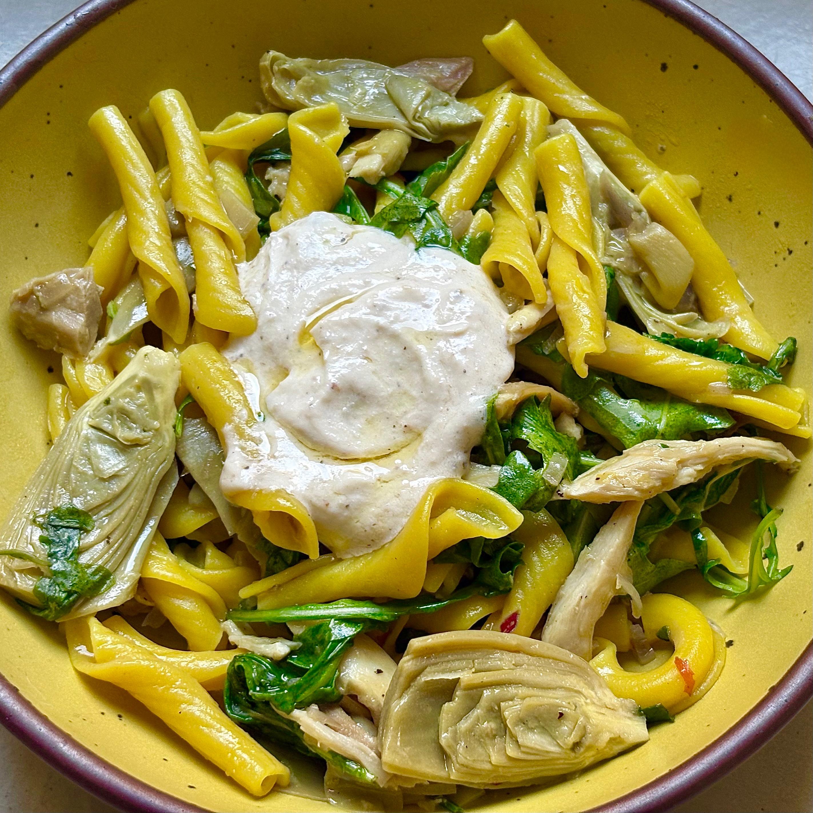 From Six Seasons of Pasta by Joshua McFadden and Martha Holmberg: Pasta with artichokes, chicken and lemon ricotta p 152 This was not on my radar screen but I had some of that preserved lemon whipped ricotta left and everything else was on hand so I tossed it together and it was excellent. I used leftover roast chicken instead of cooking it from scratch, frozen artichoke hearts and a lemon flavored pasta. The use of chicken broth in the sauce was very effective. I will most likely repeat this as a veg version with mushrooms instead of chicken, maybe with the addition of red bell peppers. The chicken was very good, I just wouldn’t cook it specifically for this. I’d also take the time to cut the artichoke hearts into smaller slices. The book doesn’t recommend flavored pastas but I had it on hand and thought this was a good use of it. The recipe seems to add the whipped lemon ricotta and lemon agrumato oil as toppings but I’d probably just mix them in.