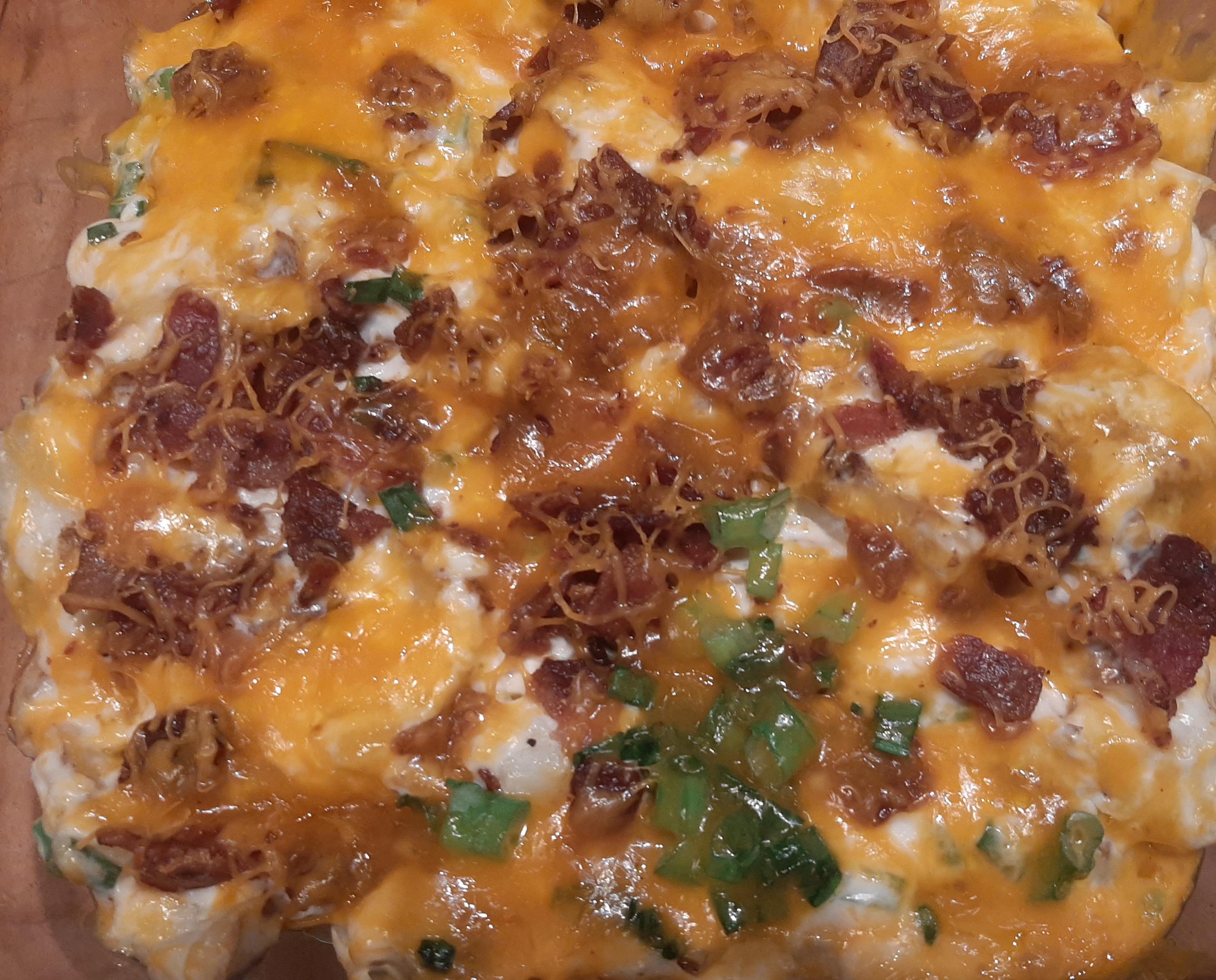 Over here I reported getting a 5-gallon bucket of russet potatoes. Today was a good day to try one of several casseroles I've had my eye on: mimicking stuffed baked potatoes, and mimicking a store-bought casserole I had enjoyed (see here) from Miiller's in Llano, TX. So, today I tried the first of several recipes: Fully Loaded Twice-Baked Potato casserole, from afeastfortheeyes.net. Delicious. It was easy, and a good excuse to cook up a lot of bacon ends and pieces I bought recently. I don't think the texture is the same as the Miiller's dish, but this has far fewer ingredients and is delicious. I can only show the "as baked" photo this time; the plated dinner portion is blurry. No matter; I should have lots of chances to show this again. This recipe is a winner!