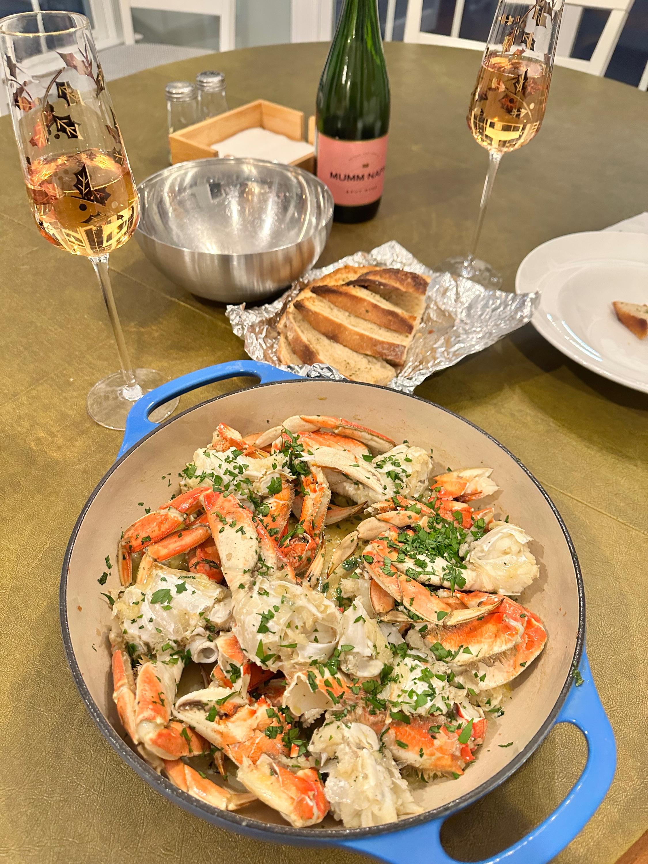 New Year’s Eve dinner. Splurged and bought two pounds of Dungeness Crab. Made garlic bread from a leftover loaf of my sourdough, and popped a bottle of Mumm’s. Leftovers will be a grilled crab sandwich.