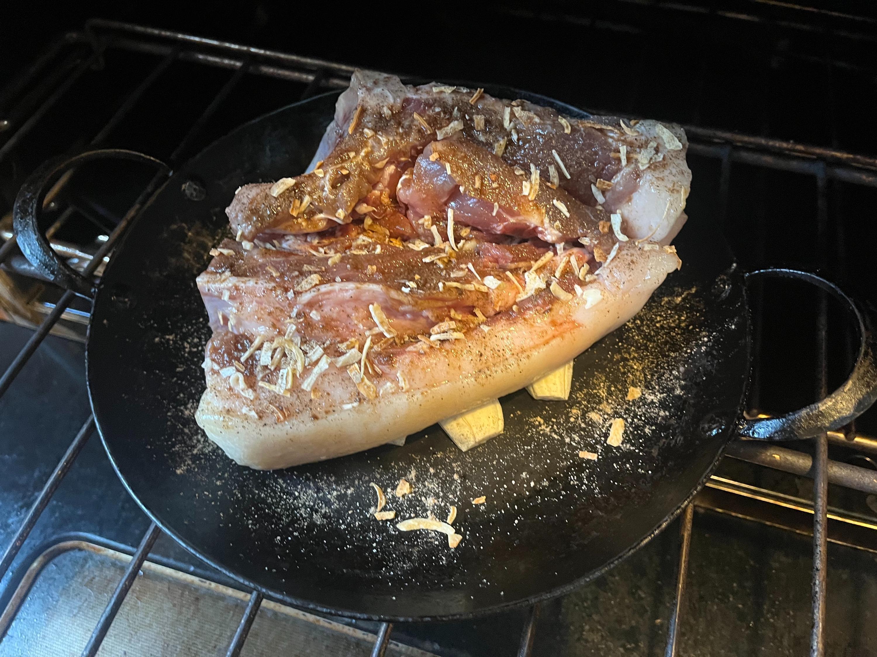 My butts come divided into 3 smaller roasts, too. I mean, that's how I request them. I had pulled one out and had it seasoning hte last few days, and decided to do it a la Smithy's onion soup mix idea. Except instead of potatoes, I have put green plaintains in the bottom. The reason for this is, I bought these little mini-looking bananas the other day thinking that they were a sweet banana; I was coming from the gym and out of my mind with hunger for something sweet, and I saw the banana, and paid zero attention to the fact that they were plainly sitting next to the the plaintain bin, and not over by the sweet fruit. I just bought em. And nearly choked when I tried to shove one in my mouth outside the store, immediately after purchasing. So, I had a few mini VERYSTARCHY plaintains left. They are now providing a bit of a bed bed for 2 pounds of pork butt that has been sprinkled with lipton onion soup mix. I figured, I like mofongo with pork chunks in it, so . . . . I'll report back. NB: This butt looks like it's been brutalized because I cut out about a pound of it to separately confit for tacos. I wasn't ravenous when I did that, but I must've been mad or something. It looks like that butt got murdered, I realize.