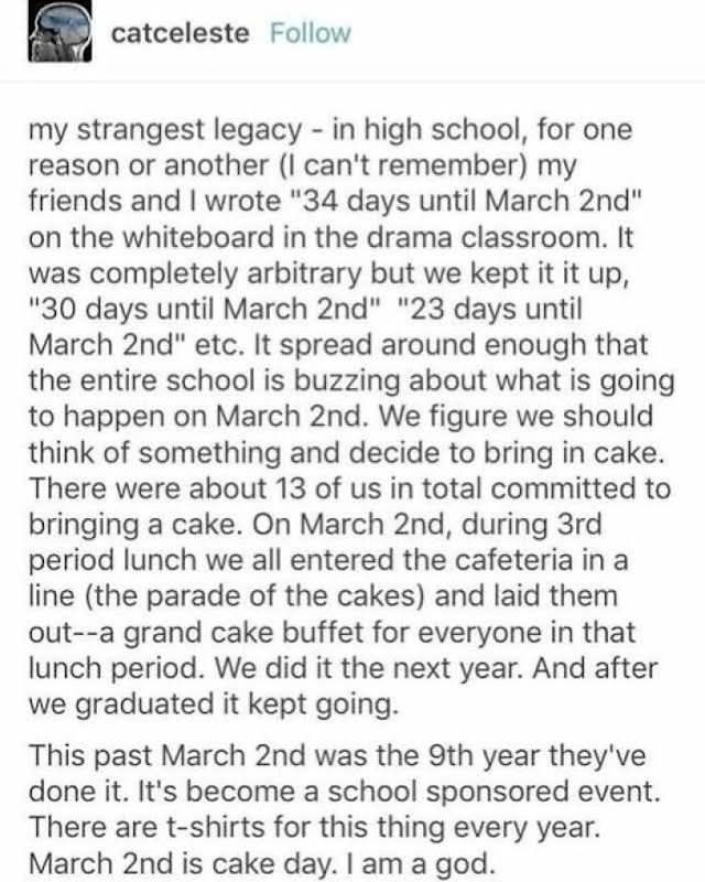 Putting it here, because "cake." My two random thoughts after reading it were a) "of course this was the drama class kids;" and b) you never know what can grow from a silly little thing you start spontaneously.