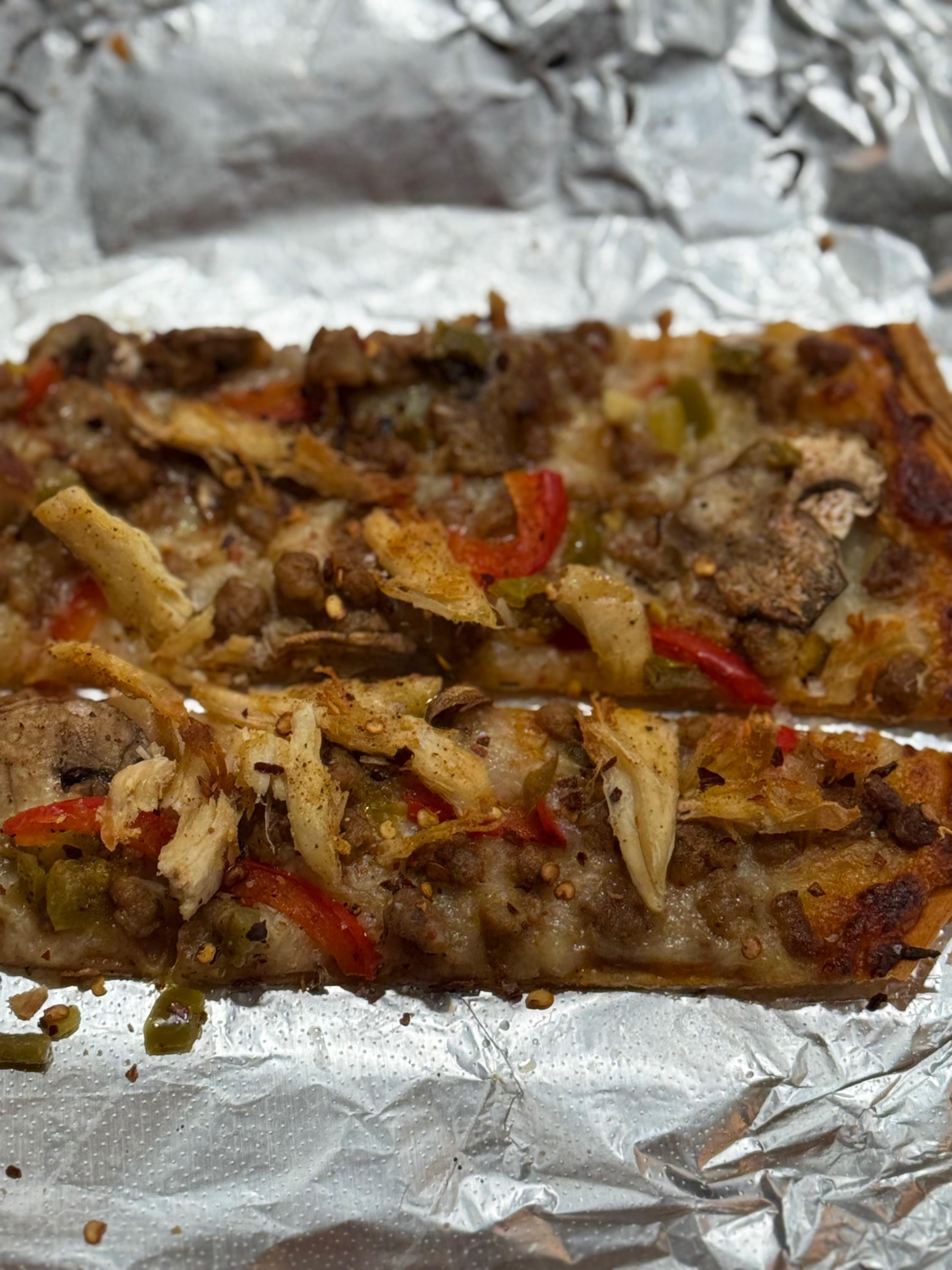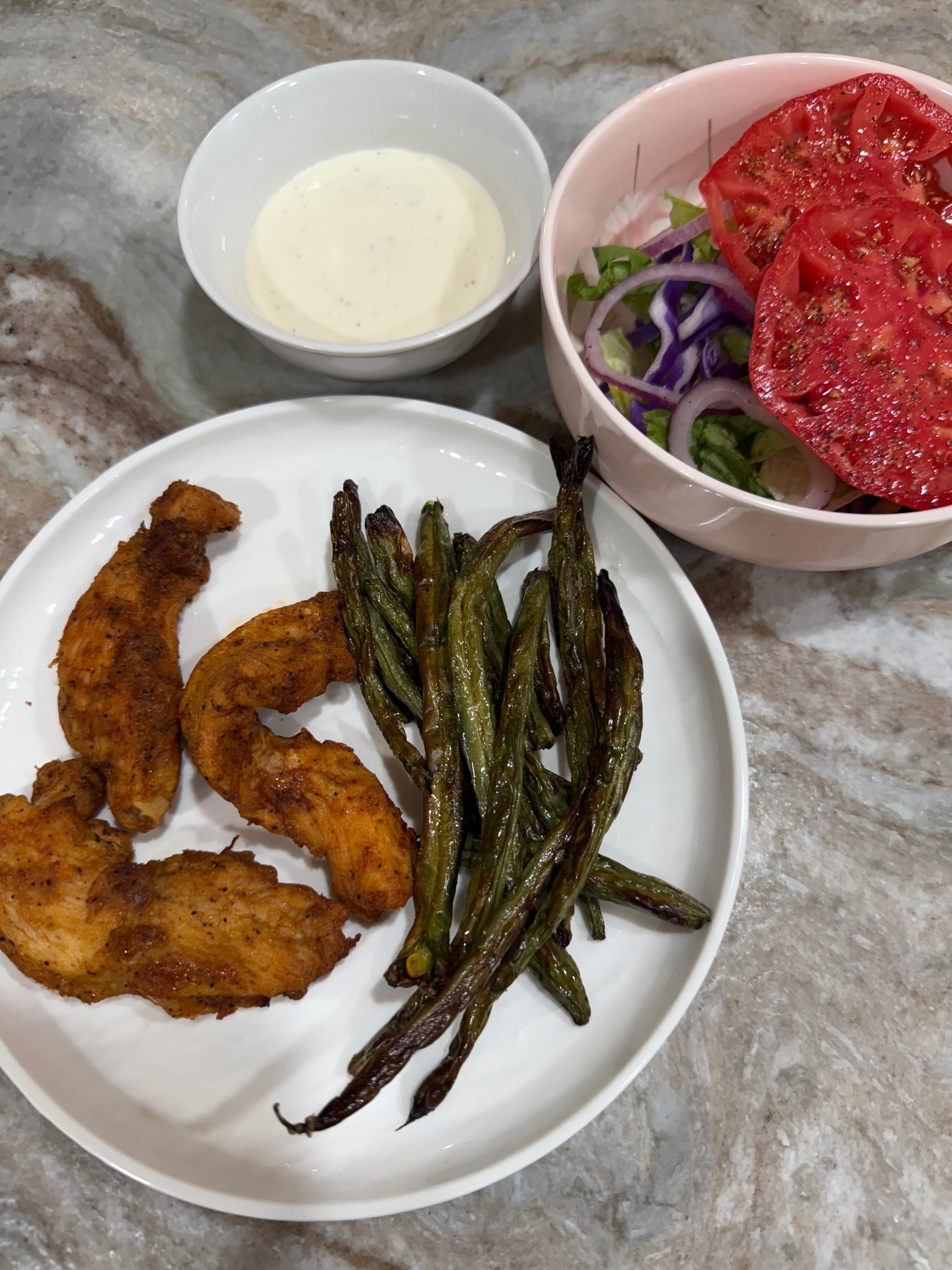 My supper on Thursday when I was too tired for much effort. Blackened chicken strips (frozen from Costco), air fryer green beans, and a small salad with a couple of heirloom tomato slices that were surprisingly okay. And a little bit of Ranch from a packet for dressing the salad and dipping the chicken (the only way it is halfway decent). I had leftover tortilla pizza for supper last night. Low carb wheat tortilla, Rao’s pizza sauce, Italian blend shredded cheese, sausage crumbles, red bell pepper, mushrooms, and bits of leftover rotisserie chicken. At lunch the chicken was less dry.