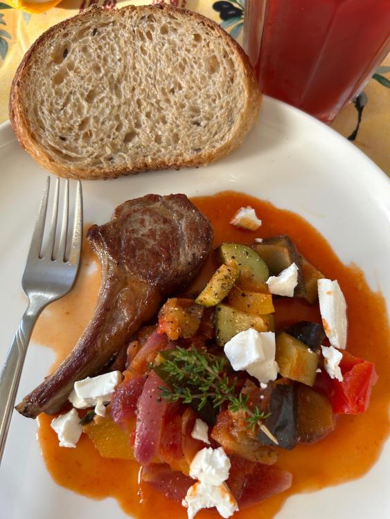 Those noodles back up the thread look so silky and delicious. @liuzhou We had ratatouille again and lamb cutlets again. I’m obsessed with feta at the moment and put little sprinkles of it on lots of things. Sourdough breading for mopping up the juices.
