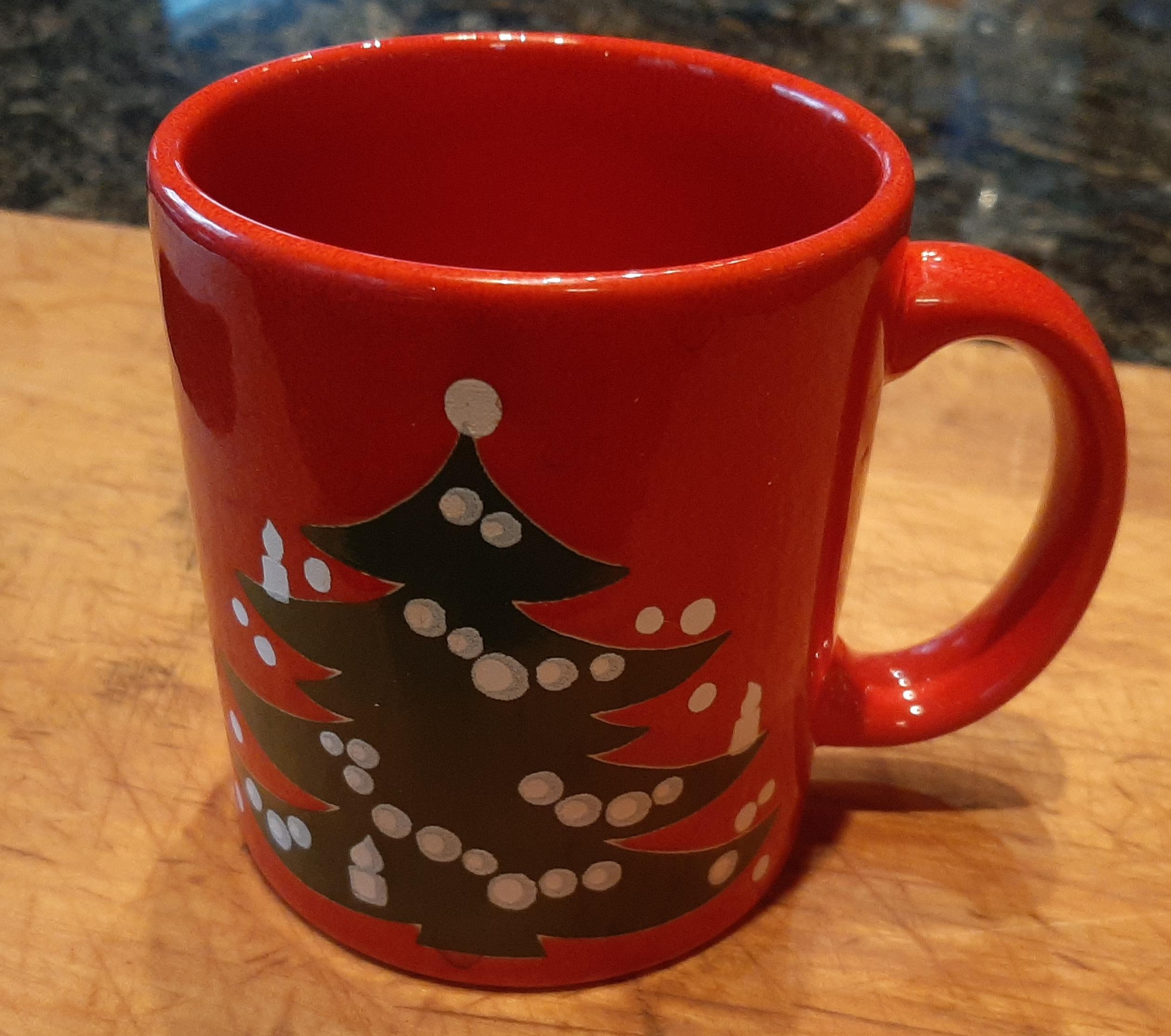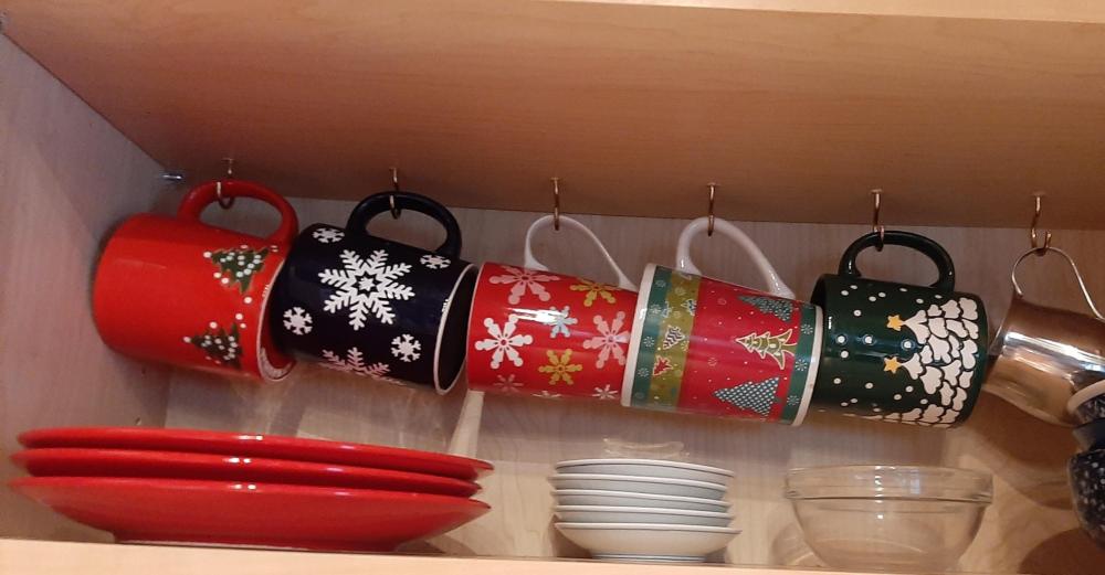 I'm just now getting my Christmas dishes and decorations out, but today my coffee is in one of those Waechtersbach mugs: I went crazy over those some years back, and still treasure them. This cheerful sight of my cupboard shows more of my Christmas mug collection: The 2nd and 3rd mugs from the right were a clever idea from a friend who threw a 95th birthday party for another friend, who was a Midwinter's Day baby. The party organizer scoured thrift stores for Christmas- or winter-themed mugs. It was quite a collection, and she invited us to take mugs home after the party. I took 4, kept them in the Princessmobile, and have 2 out for this season. Memories!