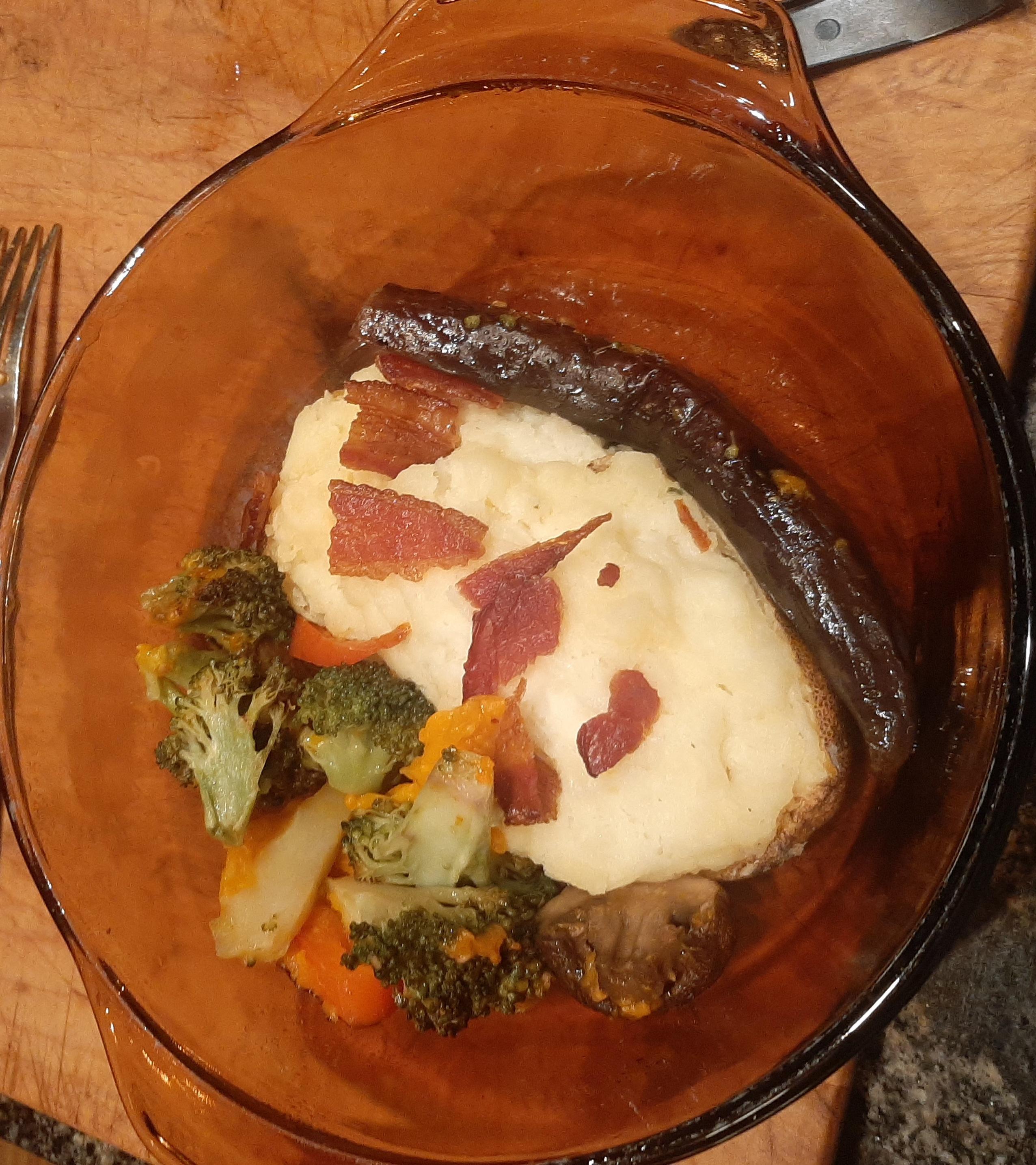 I noted over here that my darling's daughter recently gave me a bunch of twice-baked potatoes, frozen and vacuum sealed. Tonight's dinner was one potato half, with her special cream cheese / potato filling, and some of last night's roasted vegetables. One half strip of bacon over the top added a nice bit of salty goodness. This has to be one of the easiest and most filling microwave dinners I've made in a long time!