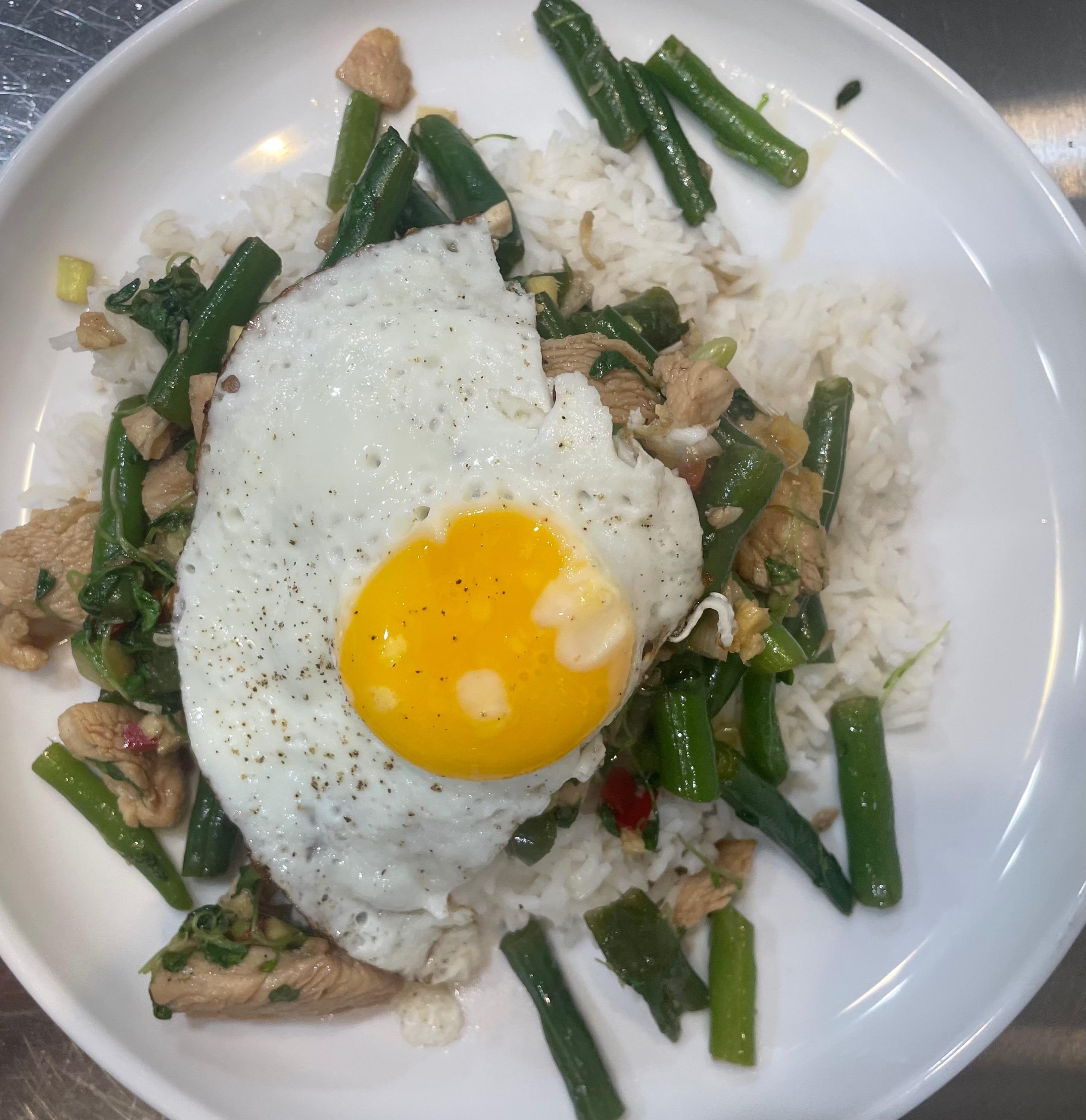 Chicken and Green Bean Stir-Fry - in the wok with chicken breast, green beans, scallions, fresno chili, garlic, ginger, soy sauce, fish sauce, lime juice and finished with some arugula microgreens. Served over rice and topped with a fried egg