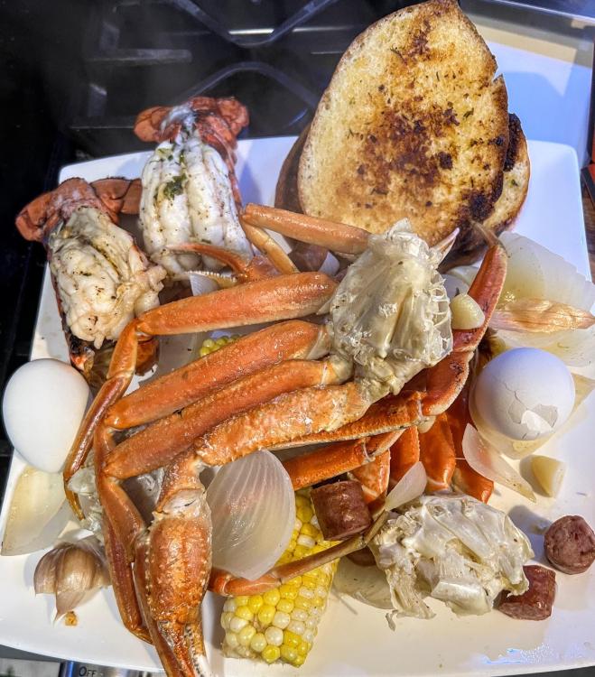 When we had a Cuban recipe for lobster, it made me want to do lobster again as I usually have it (not that I usually have it). So when Charlie asked for a crab boil dinner a few days ago, I thought it would be a good time to use lobster instead of shrimp with the crab legs. Only I broiled the lobster separately.