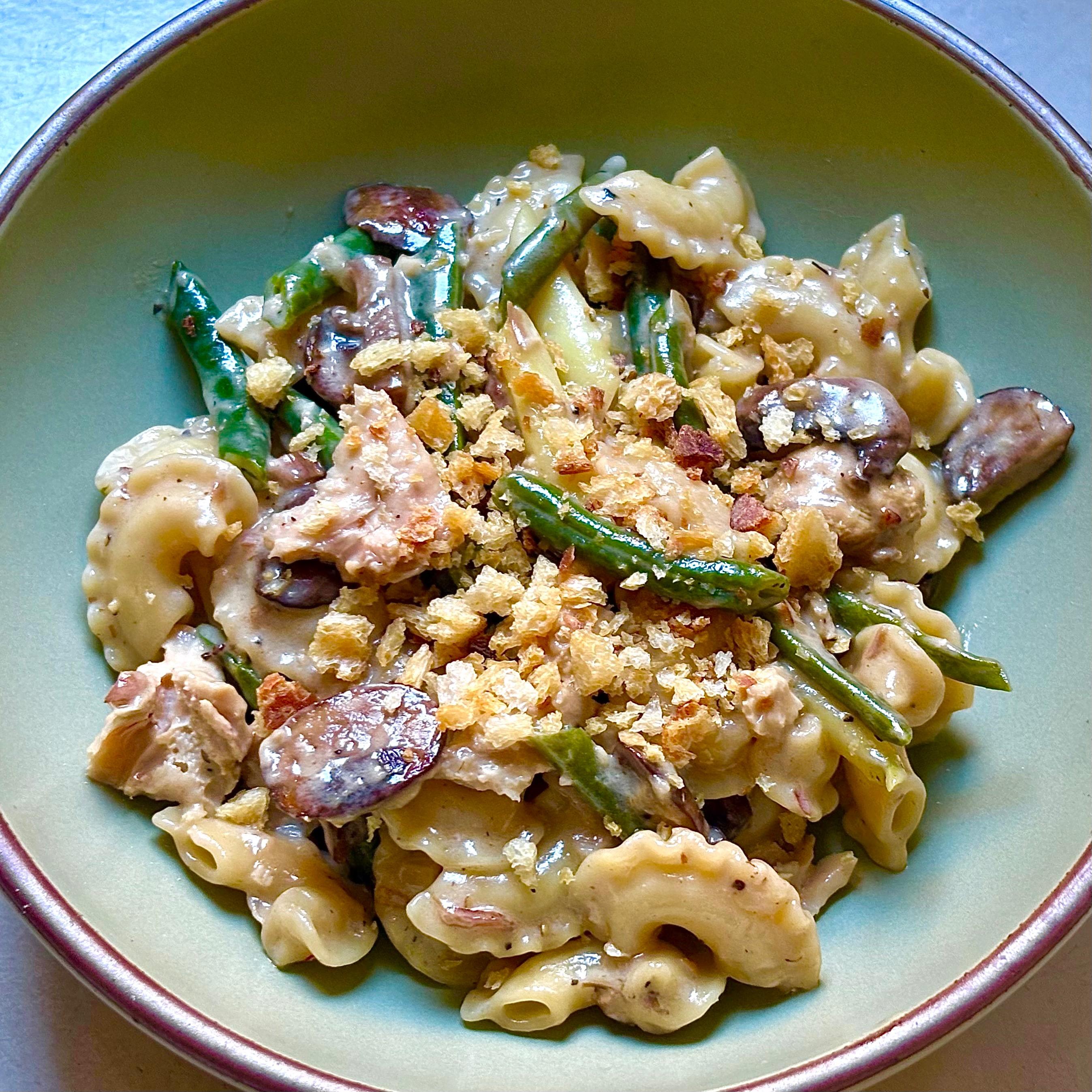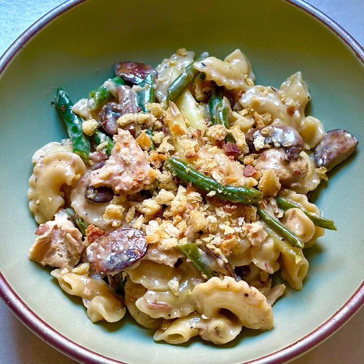Here’s the pasta (I used creste de gallo) with green beans, tuna and mushrooms from Six Seasons of Pasta by Joshua McFadden: I thought this was a skillet version of tuna noodle casserole, especially with the breadcrumb topping but the header notes say it’s inspired by the traditional green bean casserole. If so, why not use those French fried onion rings instead of breadcrumbs? No matter, this is a delicious bowl of comfort food. And he does have a tuna noodle casserole with asparagus, so there’s more of this Midwest vibe to come.
