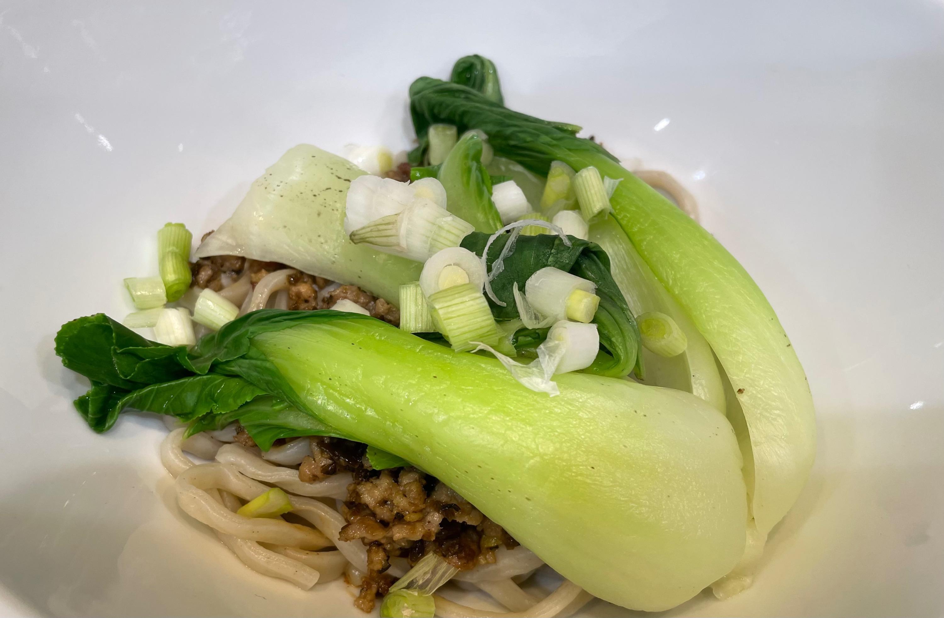 Dan Dan Mian - chili paste made by slowly roasting ground sichuan peppercorns, sichuan chili powder and cinnamon in oil and then mixing with soy sauce, tahini, hoisin sauce and zhengjiang vinegar. Baby bok choy quickly blanched and ground pork stir fried either ginger, garlic and ya cai. Served with Chinese wheat noodles and topped with scallions