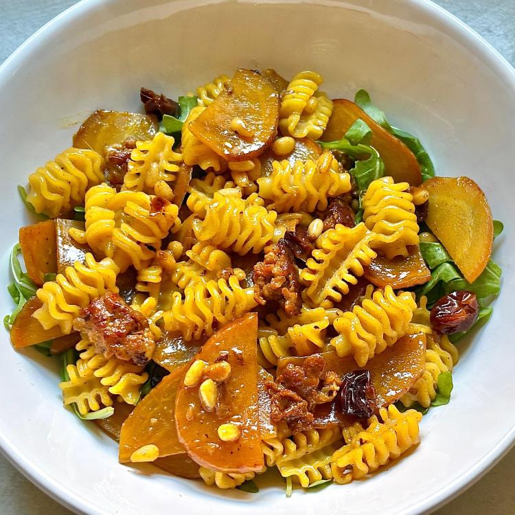 Radiatore with golden beets, raisins, pine nuts, and sausage p 209 in Six Seasons of Pasta. The golden beets play well with the classic Sicilian flavors. I loved the beautiful gold color they added to the pasta. Per the recipe, the beets can be either shredded or cut into thin wedges. I chose the later and they did take a while to cook. I used regular raisins which worked fine and added a handful of arugula.
