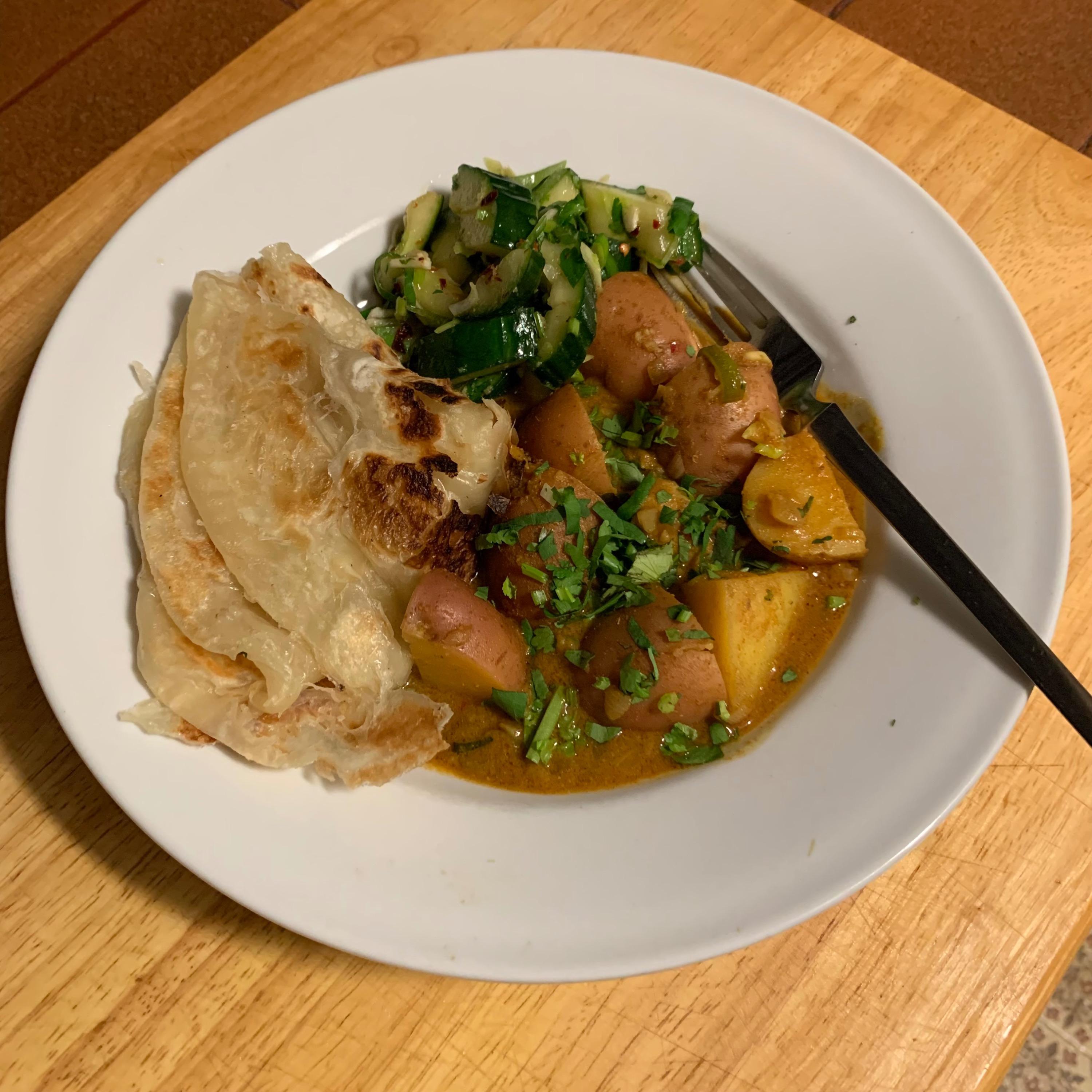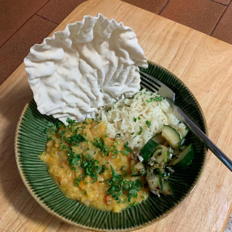 Once again I forgot I’m back posting here. So here’s a catch up. Things in a bowl with miso chicken, rice, baby pak choy and the last of another bag of bean sprouts. Roti canai using potatoes instead of chicken, smashed cucumber on the side. A cheat, seafood risotto at the local tavern which was sooo good I forgot to take a photo until partly demolished. A mixed veggie dal with rice, cucumber salad and a pappadam.
