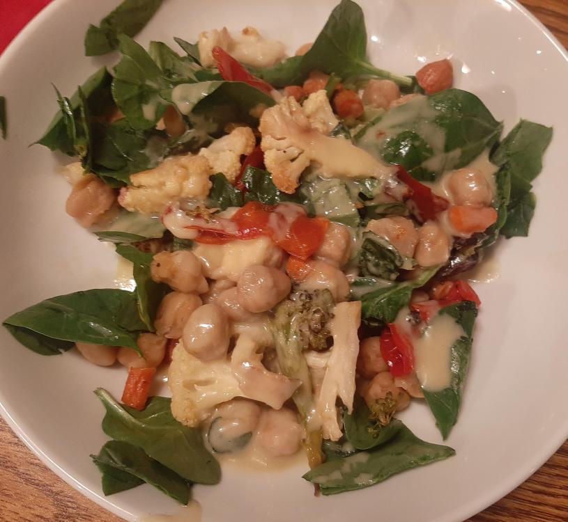 I didn't get to that today after all, although I tried some of the dressing with mashed potatoes from the refrigerator and found it was a worthy lunch. I did start to pull potatoes from my frozen bucket in the garage, but they are so hard-frozen together that I figure I'll go after them with a chisel tomorrow. 🙂 What I did do today was make her Creamy Sesame Ginger Dressing, with the intent of having more than one dressing available in the refrigerator. After that I worked on outside chores, and when I came back inside (having given up on the potatoes) I was HANGRY. And not sure what to eat, but it needed to be quick. I pulled together a salad of already-roasted vegetables -- handy things to have in the refrigerator -- and chickpeas, heated them in the microwave, tossed in some spinach, and dressed with that sesame-ginger dressing. The dressing is another keeper. I had doubt about it when I was tasting it by itself, but atop those vegetables it's a fine dressing indeed.