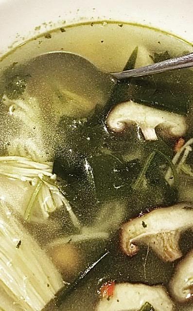 Soup again… we love soup. This time with different mushrooms. Enokitake plus shiitake mushrooms, chicken, coriander, chilli, lemon grass, Vietnamese mint… love an Asian broth soup. The Vietnamese mint is growing like mad in the garden but not so the Vietnamese basil nor the sweet basil.