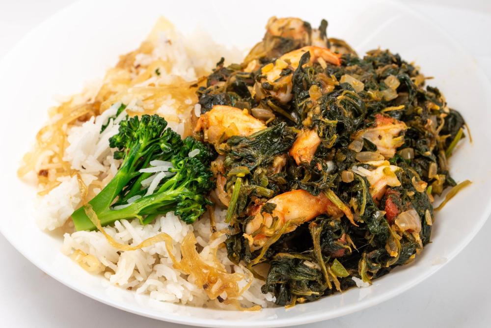 Gonna call this palak jheenga (spinach with shrimp instead of paneer): Spinach and cilantro sauteed with serrano chiles, ginger, and salt. Separately saute fenugreek seeds, diced onion, garlic, and cumin seed, cook down with crushed tomato, and then combine with the spinach, moistened with a little chicken broth. Shrimp were seared and added in last. Basmati rice pilaf with onions and broccolini: Fry cardamom pods, cloves, and canela, then add sliced onion and fry slowly with a little sugar. Broccolini was sauteed separately with black mustard seed and cumin seed, then everything was mixed together. I was supposed to divide the onion, half with the rice and half as garnish, but I goofed up. Oh well, no complaints.