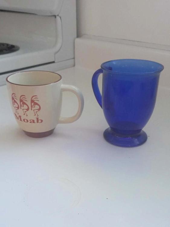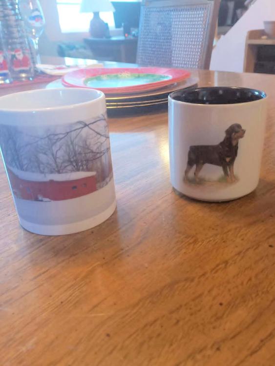 Our daughter is here this weekend and I pressed her into taking some photos on my behalf. Mug on the left bears a photo of the drive shed, Ed's lair...which is strictly enter at own risk, preferably wearing sturdy boots with steel-capped toes. Ed's sister gave the mug to Ed as a Christmas present one year. Mug on the right is a Rottie of course, a mainstay of our lives for almost forty years now, and only one of many Rottie mugs and stuffies and plaques and t-shirts and nighties and you name it (and Hummingbird things also) we have been given by the wonderful friends from the States and Ontario and Quebec who attended 20 years of Annual Dog Weekends (and I use the term loosely...from Thursday to Tuesday for the Delaware folks) at the farm. What incredible memories of those times. The mug on the left says Moab, our home away from home and it's been 8 years since we last were there. 1985-2017. I still miss it and when I see Facebook short reel videos of the area, my heart clenches sometimes. The graphic is of course Kokopelli. Kokopelli and southwest lizards were our late son Steve's favorites. In fact, one of our upstairs bedroom is the Kokopelli Room (yes, our bedrooms have names...we are nothing if not pretentious) filled with Kokopelli bits and bobs we brought back over the years for him. We did take Steve with us to Moab one year. The blue glass mug is just that, blue glass, one of my favorites. The first years on the farm I bought a complete set of blue glass plates and glasses and bowls and mugs. They're almost all gone now, except for some mugs and two large serving bowls, but I still have and use the blue handled cutlery ...which Ed hated...said they were too light and small. So I use it and everyone else has a heavier, more conventional set to use. It's hard to believe but we've been on the farm 35 years. Of course it's hard to believe that we are in our mid-80s and have been together since I was 15 and he was 16. Sorry, I'm old and I tend to ramble...