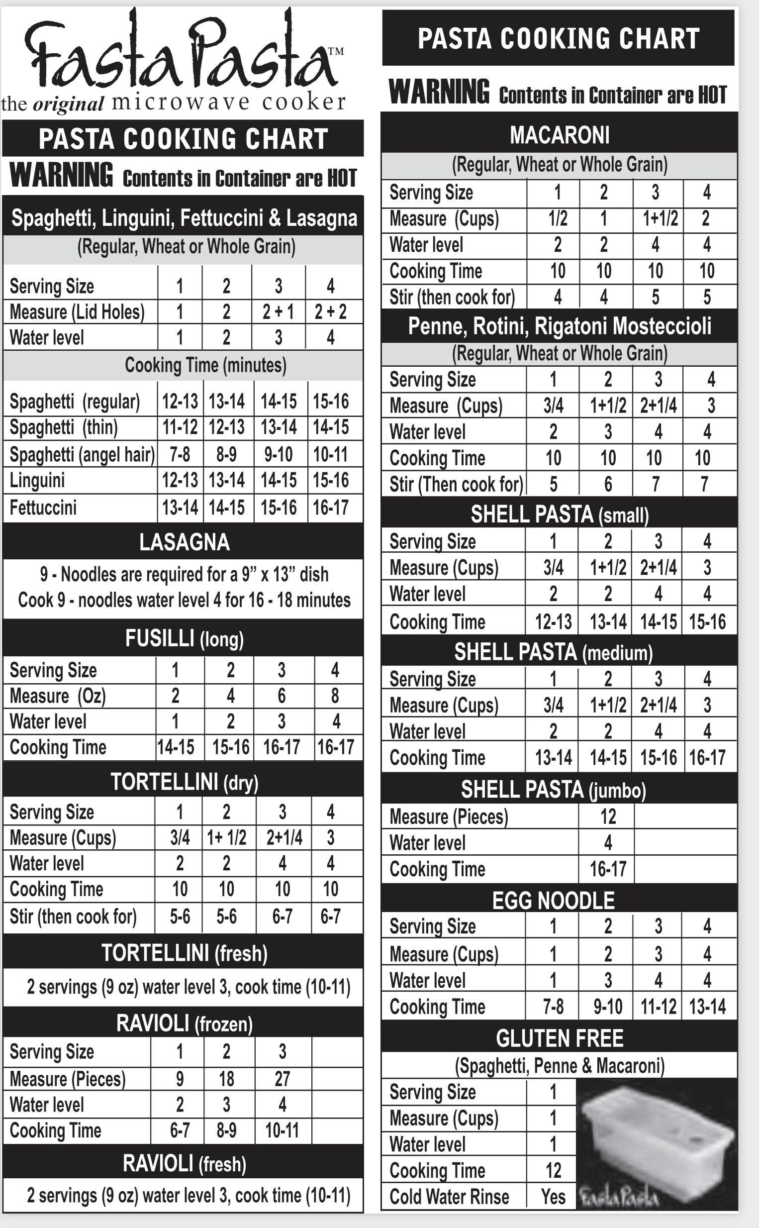 @weinoo interesting poinnts however , many people do have a microwave , and a comprehensive ' pasta ' book should go over the technique. for completeness sake , if nothing else an effective microwave container holds many many shapes i very much doubt a microwave method , properly proportioned , involves any gummy mess . I have not tried fresh pasta in the Fasta , so that area need research. I pour off the hot pasta water , over the sink , into a pyrex measuring cup. I usually get just over 1` cup . this is far more than I need for the ProkRagu version . the Campari version uses the tomato jus as a post cooking hydrator. in the winter time , the mise you've seen , and plates , except for the eggs // green onions . grated cheee sits on top of the oven , and actually warms up a bit going into the oven , and it preheats to 170 F , then is promptly turn off. so I do use a little more water than the markings on the Fasta indicate. not that much more. the volume and temp of the water ( faucet temp ) add to the determination of total Micro time. add pasta to Fasta . Salt . wsater . Micro for the time youve decided by experience gets you perfectly cooked pasta. for a portion for ' two' , based on the Fasta top holes , is 17 minutes , 45 seconds . unattended . for review purposes , FastaPasta guidelines : you see above , FP suggests 13 - 14 min for a portion for 2 for linguini . as you have noted , all types of linguini are not the same . 17:45 works for delCecco , and I add water to the level 3 , not 2 Tj's linguini ' from Italy ' a decent pasta , takes less time , same starting point. I dont think dried pasta needs to swim . its very true that the Fasta should be 1/4 " longer , as the DelCecco pasta sits corner to corner and that added 1/4 " might be usefull. not a deal breaker. no idea is DC is a tiny bit longer than other common pasta.