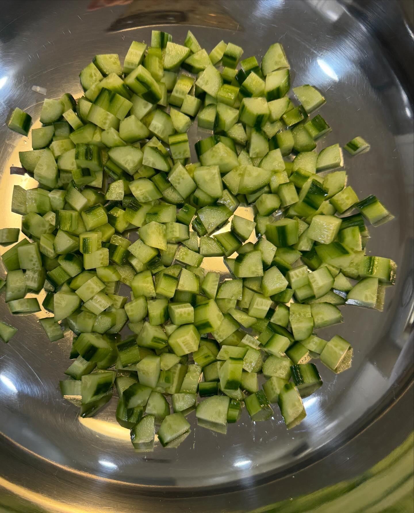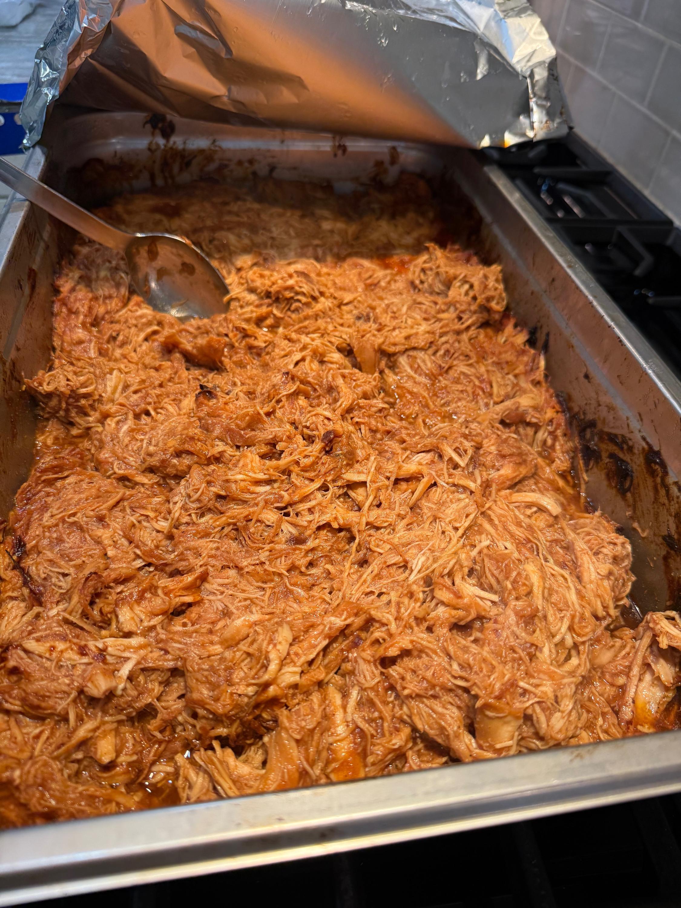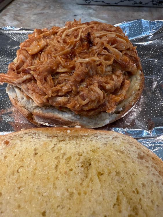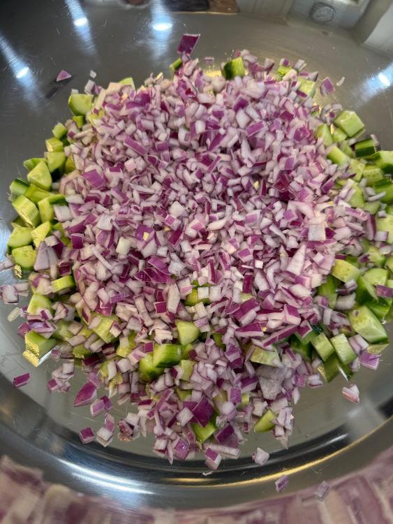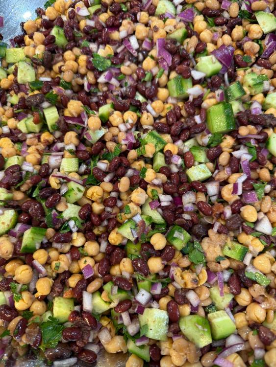 Yesterday’s CFM was delivered by 2pm. 24 boxed lunches of slow cooker BBQ pulled chicken sandwiches and bean salad. I won’t start with pictures of cooking the dried beans, but they included these two, plus a pound of small white beans. In the future, if I’m making bean salad with dried beans and not canned, I would not add aromatics or anything else that will “muddy” the salad. In the first pot of beans, which was the pinto-like bean, I’d sautéed diced carrots, celery, and onion. Regretting that decision, I used larger aromatics in the second pot so they could be fished out easily, and in the third, no aromatics, to see if the beans would look “cleaner.” They did, but too late for this salad. Four of the six English cucumbers, first layer. 1.5 large red onions, diced, soaked in water, drained. In addition to the three beans previously mentioned, 2 28 oz cans of garbanzo beans, and a couple of cans of cannellini beans were also used, plus two bunches of fresh parsley and one small bunch of dill. It’s looking pretty, but I wish I had more cucumbers because they add so much. Seasoned with salt, black pepper, garlic powder, paprika, cumin, Tony’s. Sorry I didn’t quote the posts, but @blue_dolphin, I did use Samin Nosrat’s Creamy Oregano Dressing! Thought I had pics of it, but since I made enough for an army, I’ll snap a pic a little later. I don’t have leftover salad, but I have leftover dressing. @Smithy, I bought both sliced black olives and sliced Kalamatas with the intention of trying each of those, as well as capers, and picking a favorite. At one point I reminded myself to take them out, and then never thought of them again!! Yikes. I was not ignoring your suggestion, just got caught up and forgot! @SLB, dilly beans sound dill-icious, but alas, my groceries were purchased. I could’ve run to the store and bought some the next day so I could’ve forgotten to use them, like the other suggestions. 🤷♀️ And dressed Besides chicken, this stuff went into the slow cooker. First layer of chicken in the slow cooker. After second layer, it was about 10 pounds of chicken, with enough leftover to feed my son’s family. They’re not food insecure, they just like Mom’s cooking. Right before putting the sandwiches together. There were three trays like this of lightly buttered and toasted buns. Before topping with dill slices.