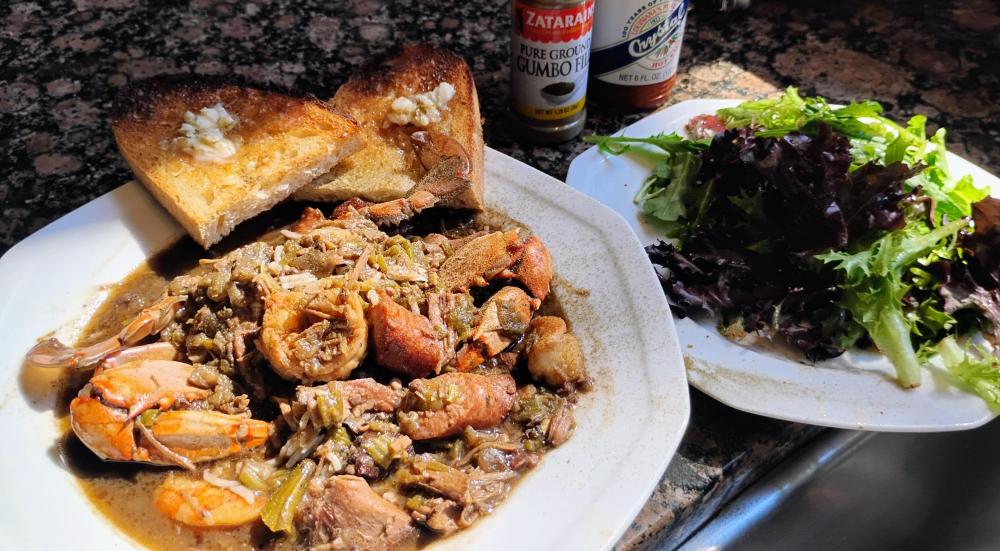 Last nights dinner and todays lunch. Okra based gumbo with smoked turkey, Conecuh sausage, shrimp and blue crabs.