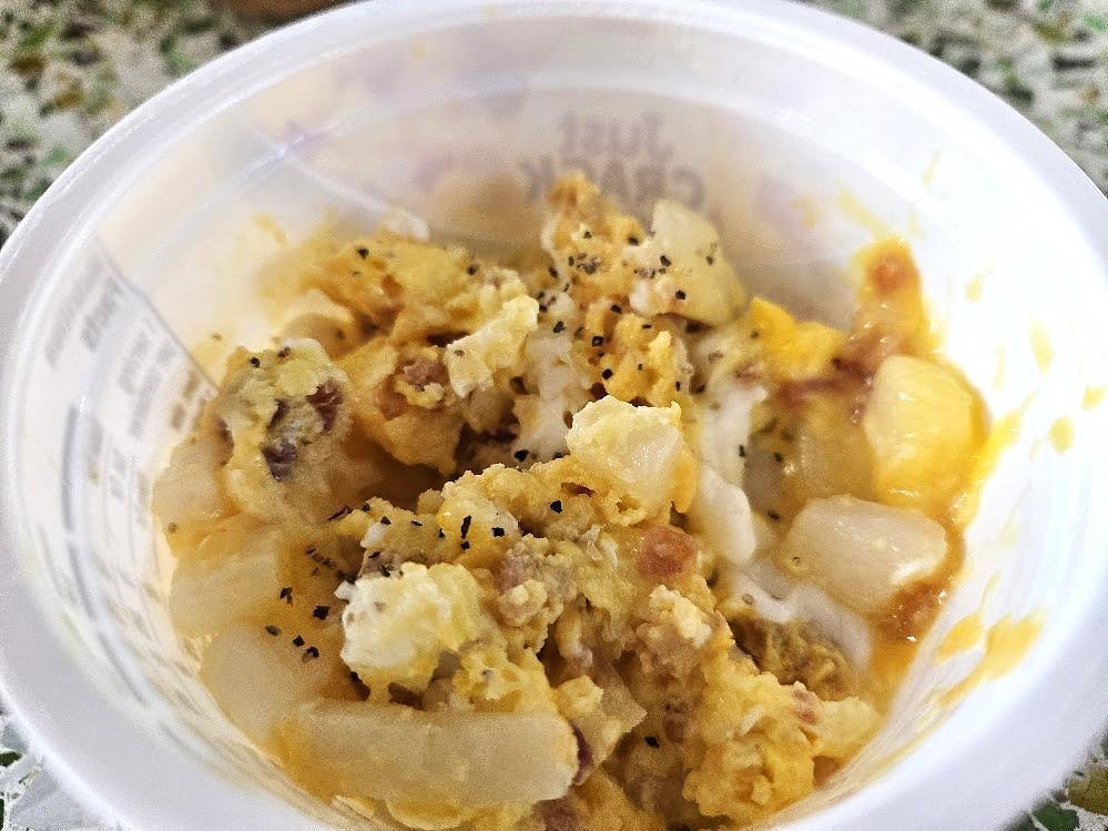 Bought a few of these to have for quick breakfast or light lunch. This flavor was Bacon, Potatoes and Cheddar. The bacon and cheese came thru flavor-wise. The potatoes were disappointing as they have no browning on them. This is a shelf product to which you add an egg (or 2). I used 2 eggs and added a few grinds of black pepper after microwaving (about 90 seconds total). I wouldn't eat this everyday (or even every week) but I like having a really fast option for a meal when on the run. We are in midst of some medical appts. and home maintenance and often want something fast, relatively light with no clean-up.