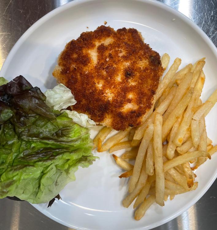 Shrimp Burger with Fries - shrimps are minced in the food processor (1/3 very fine, 2/3 in larger pieces) and mixed with mayonnaise, cayenne pepper and scallions. After forming patties, you coat them with fine ground panko crumbs. Served on a toasted brioche bun with lettuce and tartar sauce and with fries