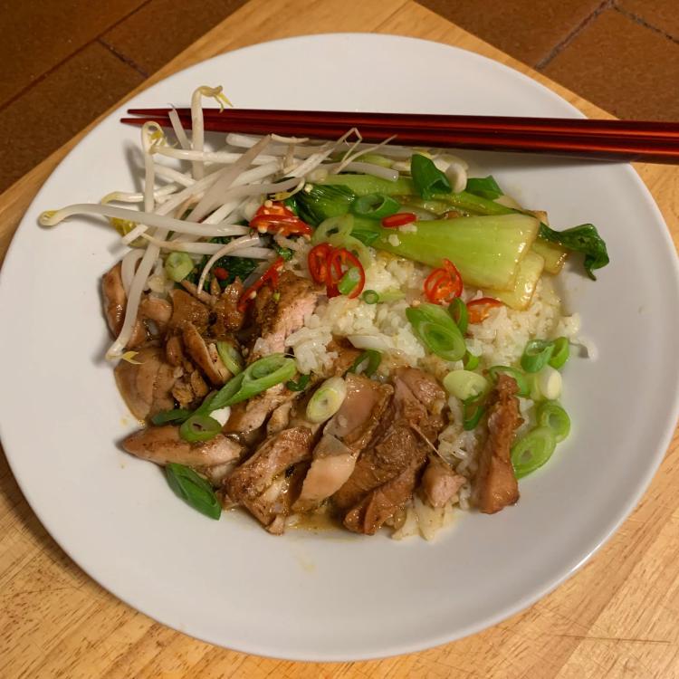 I’ve been enjoying these brothy rice with veg and protein dishes lately. This one is boned chicken drumsticks marinated with white miso, soy, honey and gochujaro, some baby pak choy and bean sprouts in chicken bone broth.
