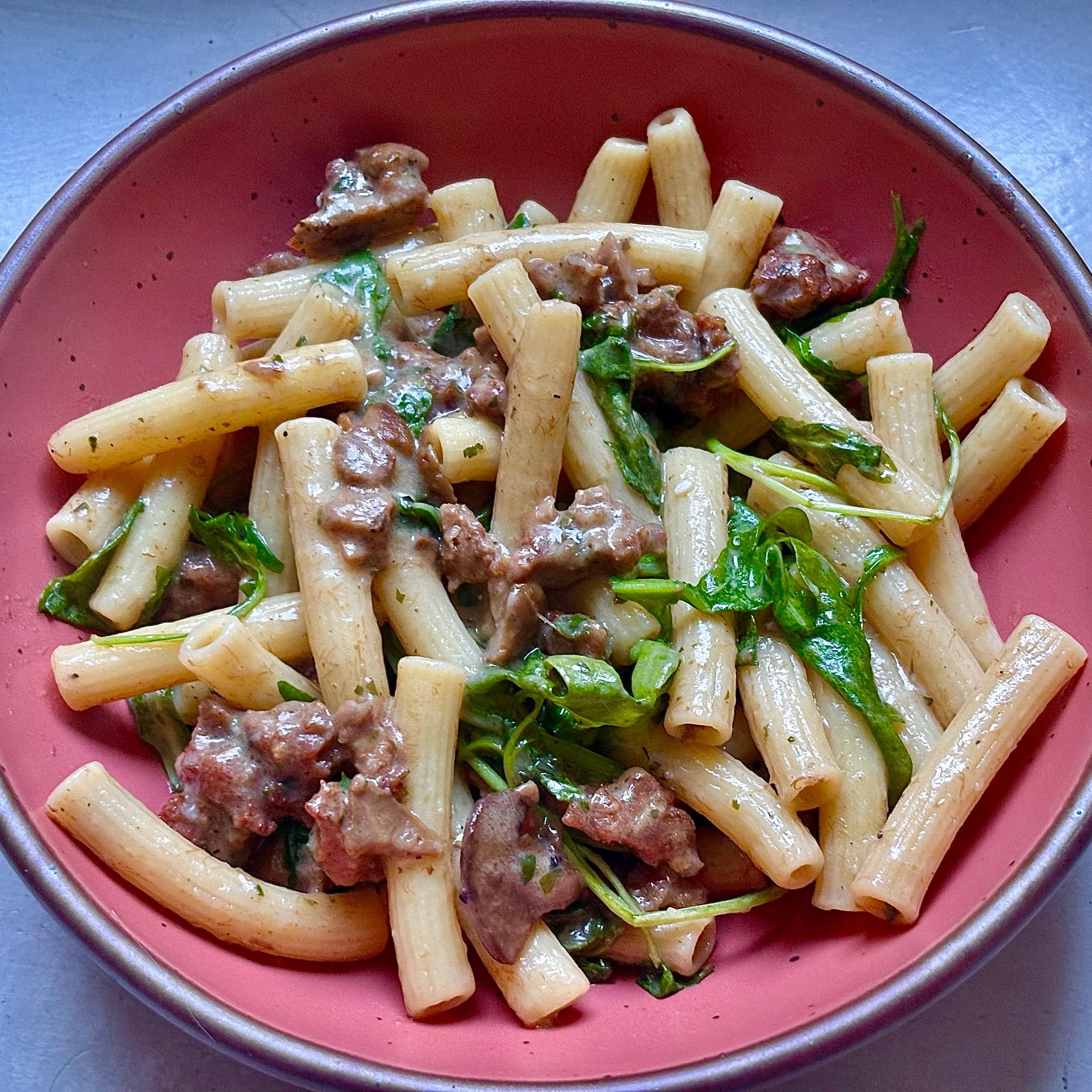 I can’t really compare with the master of re-invention, @C. sapidus, but I did make a nice pasta lunch from leftovers I took home from a delicious gnocchi with porcini mushrooms, sausage and truffles that I enjoyed at a local Italian restaurant. I ended up eating all the gnocchi but there was a lot of sausage and sauce left. I added a big handful of arugula.