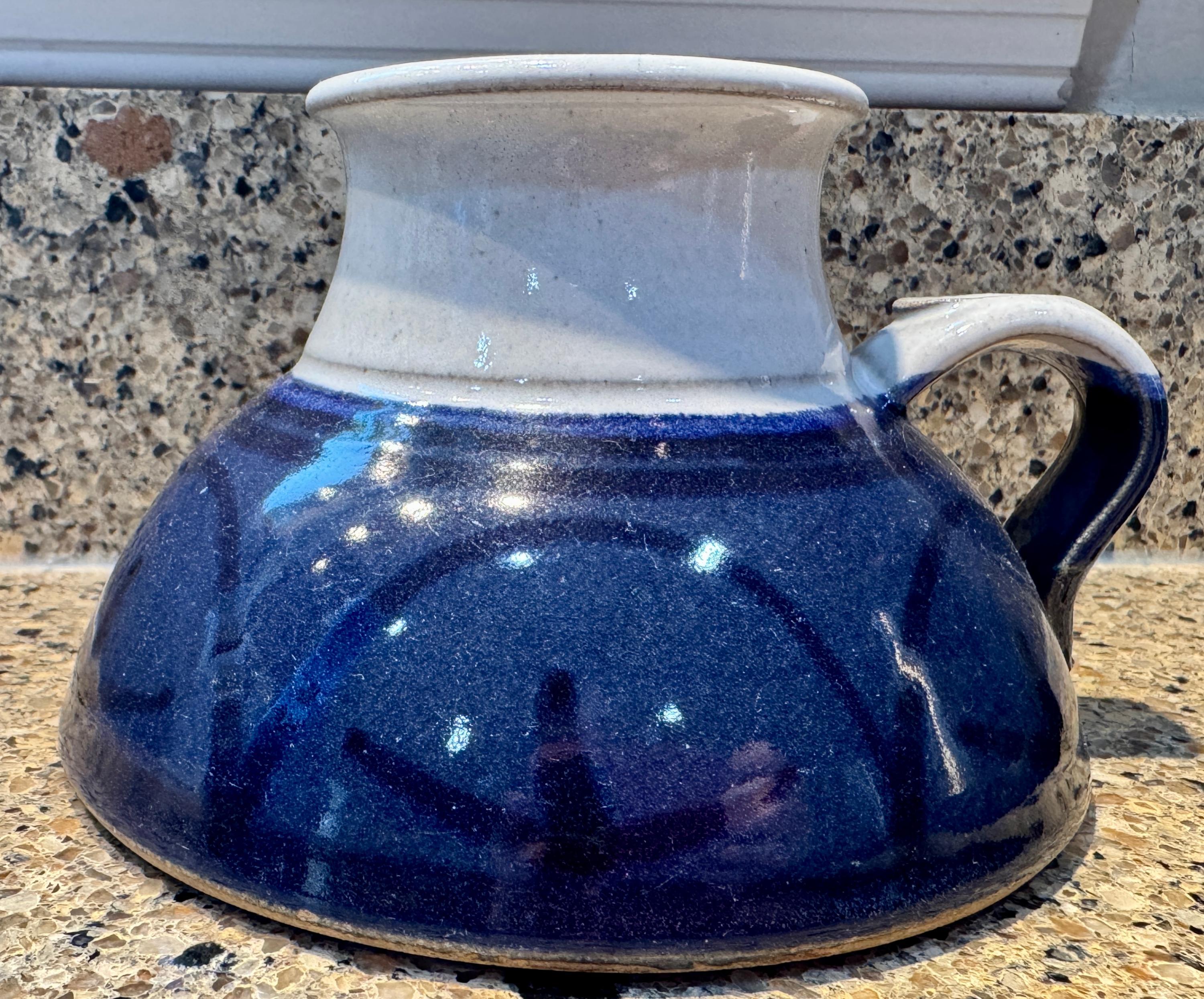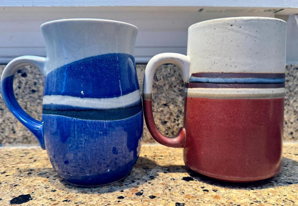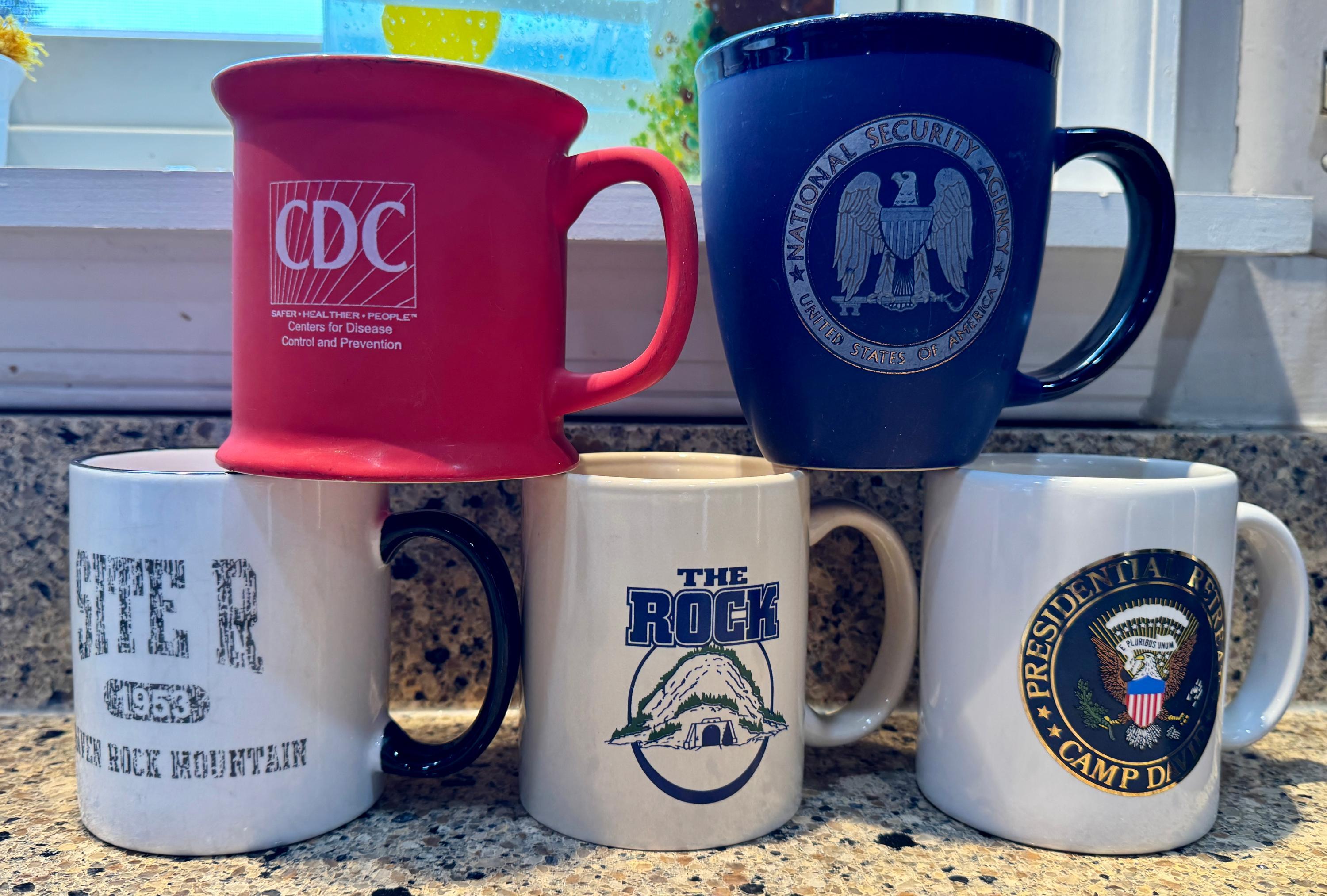 We have way too many mugs but these are notable. My mother used to pick up mugs from local craft fairs and these were two I kept from her collection. We have mugs from some, uh, unusual federal sites. I got the CDC mug for giving a pre-conference lecture there. Sorry, hard to read the lower right but that is from Camp David, the presidential retreat. This mug has seen some adventures in the past 25 years. It has a rubberized bottom and survived a several-block trip on the roof of my car. Eventually I figured out that the driver next to me was not being rude, he was letting me know I was about to lose a coffee mug. The mug also survived a car crash that caused several thousand dollars worth of damage without spilling a drop of coffee.
