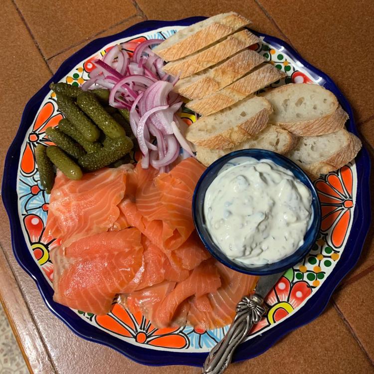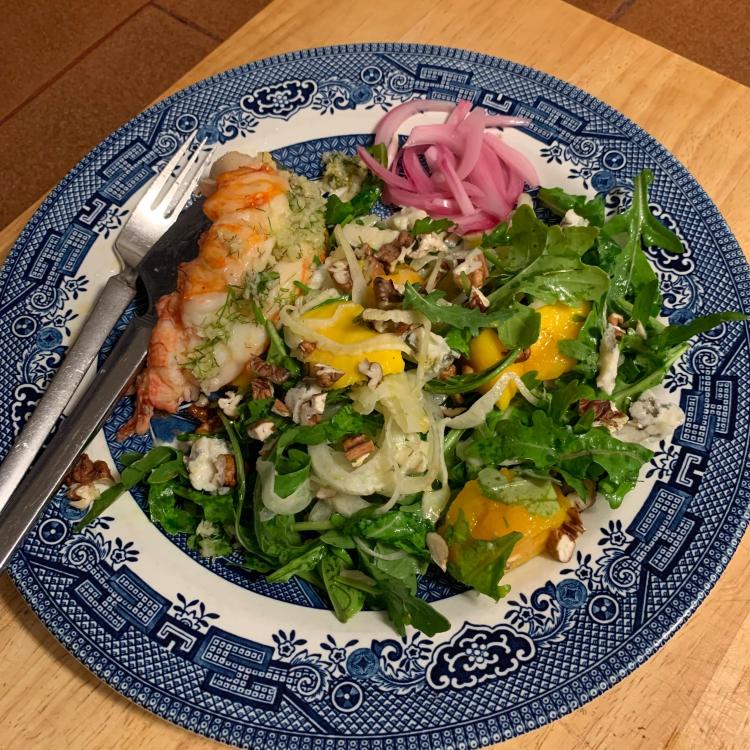 This week we had Friday night with the Carolines for a change. Here is a plate of smoked rainbow trout with a spread of cream cheese, yogurt with capers and garlic chives, some cornichons, lightly pickled red onion and sourdough baguette on which to build one’s tasty bite. Last night I made a salad with mango, fennel, rocket and blue cheese, dressed with a vinaigrette and scattered with toasted walnuts. Served with a lobster tail smothered in garlic butter and some more of the red onions for colour.