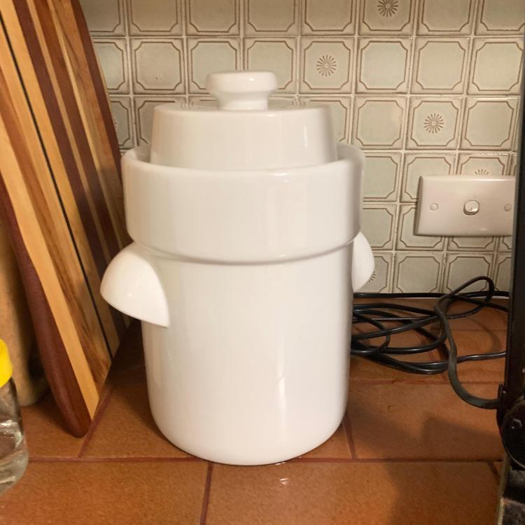 I managed to score a proper crock at a second hand store last week. Yesterday we mandolined half a large cabbage and two fennel bulbs, massaged them with salt and crammed into the crock. Hope it works, cross fingers for me please 🙏
