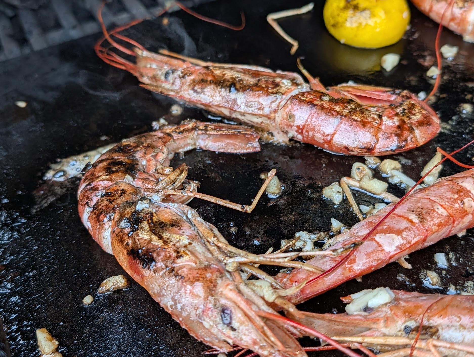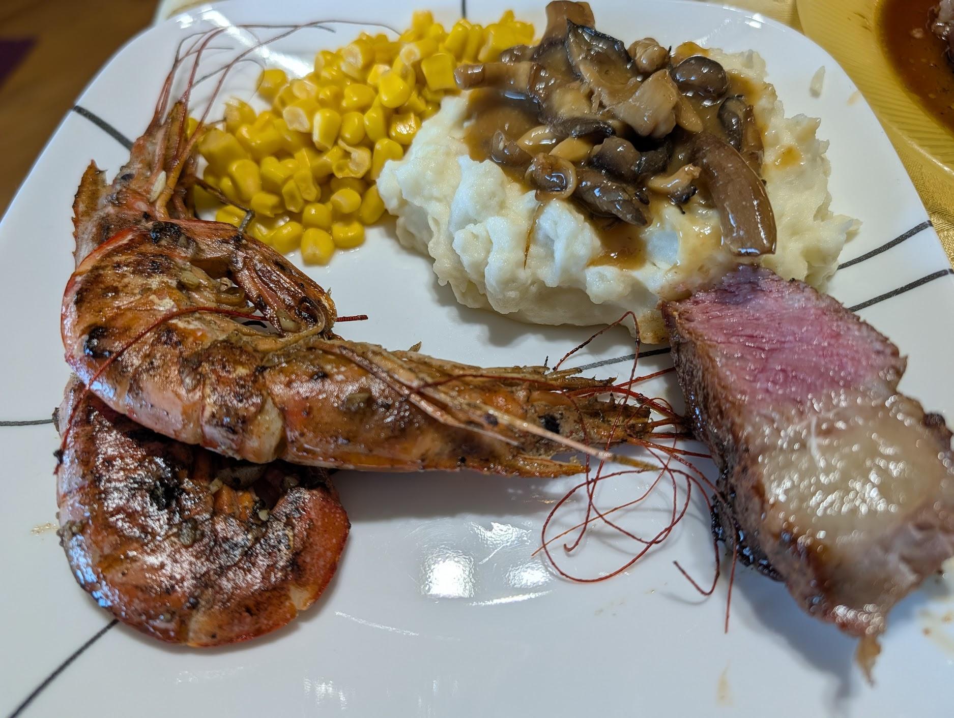 Valentine Dinner--red shrimp ( Garlic, evoo, lemon )--simple can corn-- tator w beech/ oyster mushroom gravy--Bacino's Cucina 30/30 ( wet dry house aged ) Rib eye