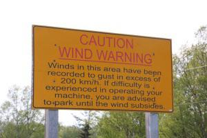 There's a place in Newfoundland, just outside of Port aux Basques (where the ferry docks), called Wreckhouse. The coastal hills have a way of funnelling the winds into one particular pass, there, which means on random days with no particular weather going on, you'll encounter gusts of up to 200km/h (120mph) on the highwayLocal tourism guides encourage people in RVs to hasten through that stretch, lest they find themselves on their sides in the ditch, but a surprising number of them stop instead to take a photo beside this sign: (I couldn't find a better photo, but it gets the idea across). There are a few other places around Newfoundland where that kind of thing happens. Shipping containers get blown off flatbed rail cars, etc.