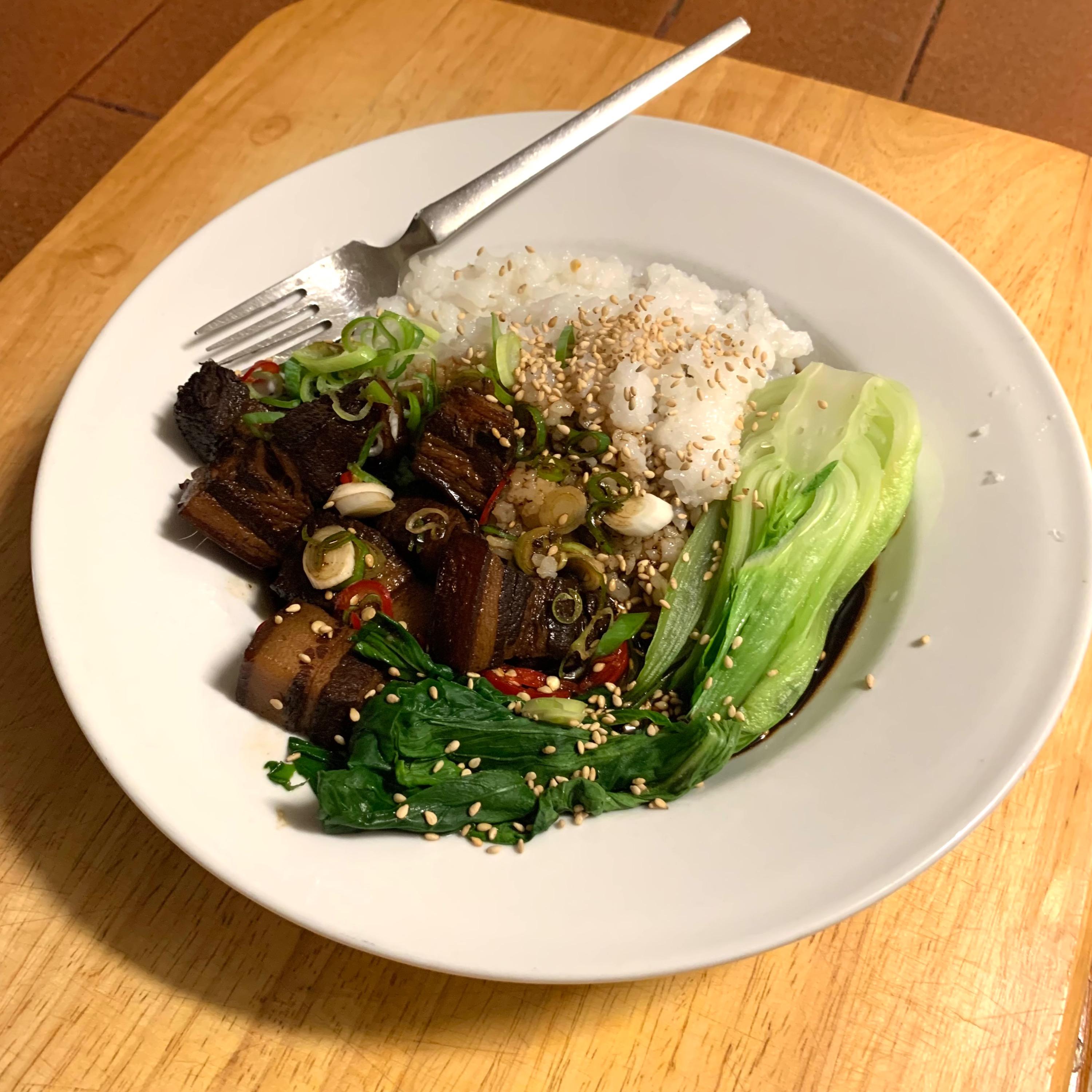 Sticky pork belly. It’s simmered in shaoxin wine, star anise, ginger slices and soy. Served on a bed of rice with steamed bok choy and topped with fresh chilli, green onions and toasted sesame seeds. Episode #38 in the series “things in a bowl”.