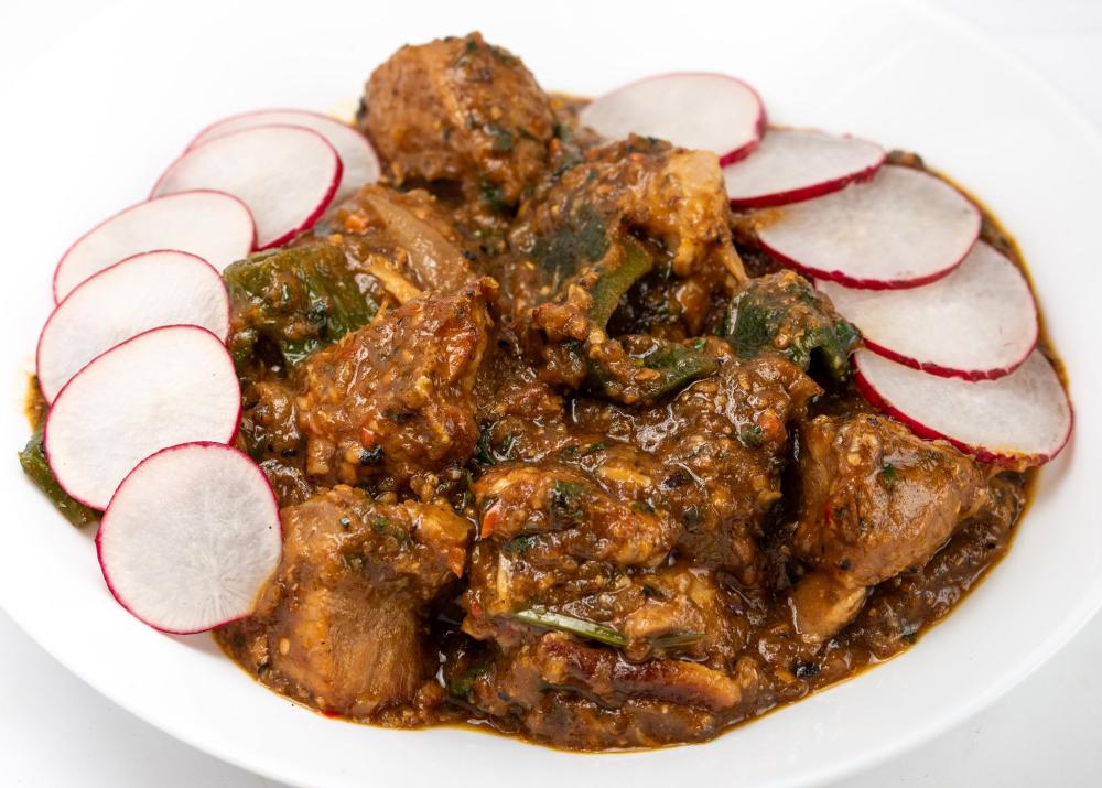Improvised chile verde with leftover carnitas, leftover salsa verde, and roasted chile Poblano. Jazzed up with bird chiles, garlic, cilantro, Mexican oregano, fish sauce, and grated Parmesan cheese. Sliced radish for crunch. Tasted good and made room in the refrigerator - double win.