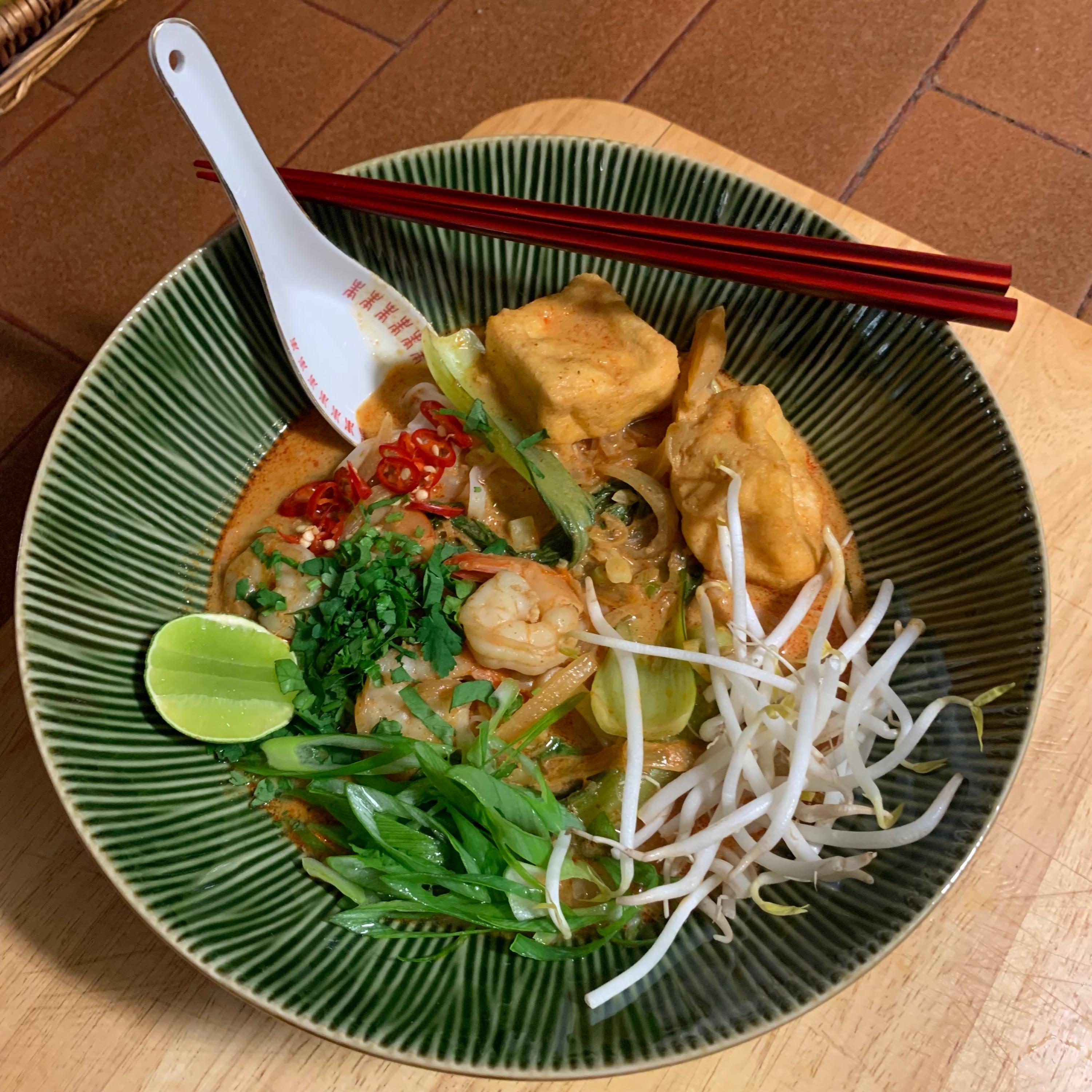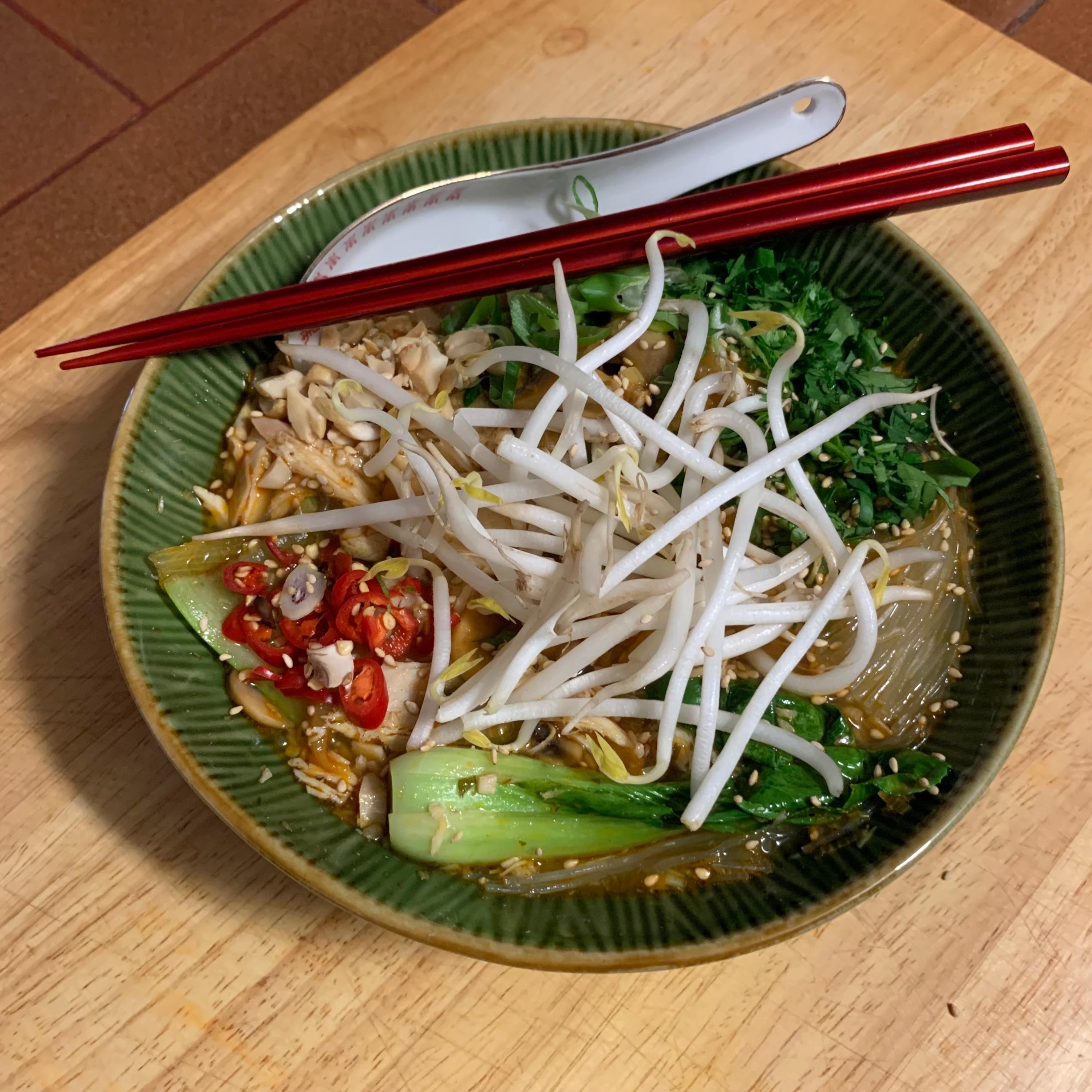 There was a bowl of things, shredded roast chicken, baby pak choy, vermicelli noodles, crushed peanuts in bone broth. Then, another bowl of things. Laksa with prawns, tofu puffs, rice noodles, more pak choy and toppings. Note a new bag of bean sprouts. Countdown is reset.