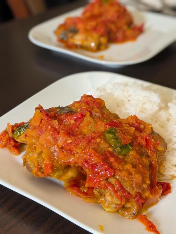 Another entry in the Most-Labor-Intensive dish contest, also from the Padang food canon... This one is ayam balado - chicken in balado sauce. You can balado-ify practically anything - chicken, eggs, potatoes, beef, fish, you name it. What qualifies it for a contender in the MLI contest? First, the chicken is braised in a ground spice paste liquid containing garlic, turmeric, candlenuts, ginger, kaffir lime leaves, etc... The chicken is removed and some of the braising liquid retained. The chicken is then shallow fried in oil, and then removed and drained, and then, in the same oil, a ground mixture of chillies and shallots (preferably ground by hand) and sliced tomatoes are fried with some lime juice, the reserved braising liquid and more kaffir lime leaves added. The result is super savory but refreshing at the same time... one of my favorites!!!