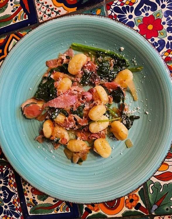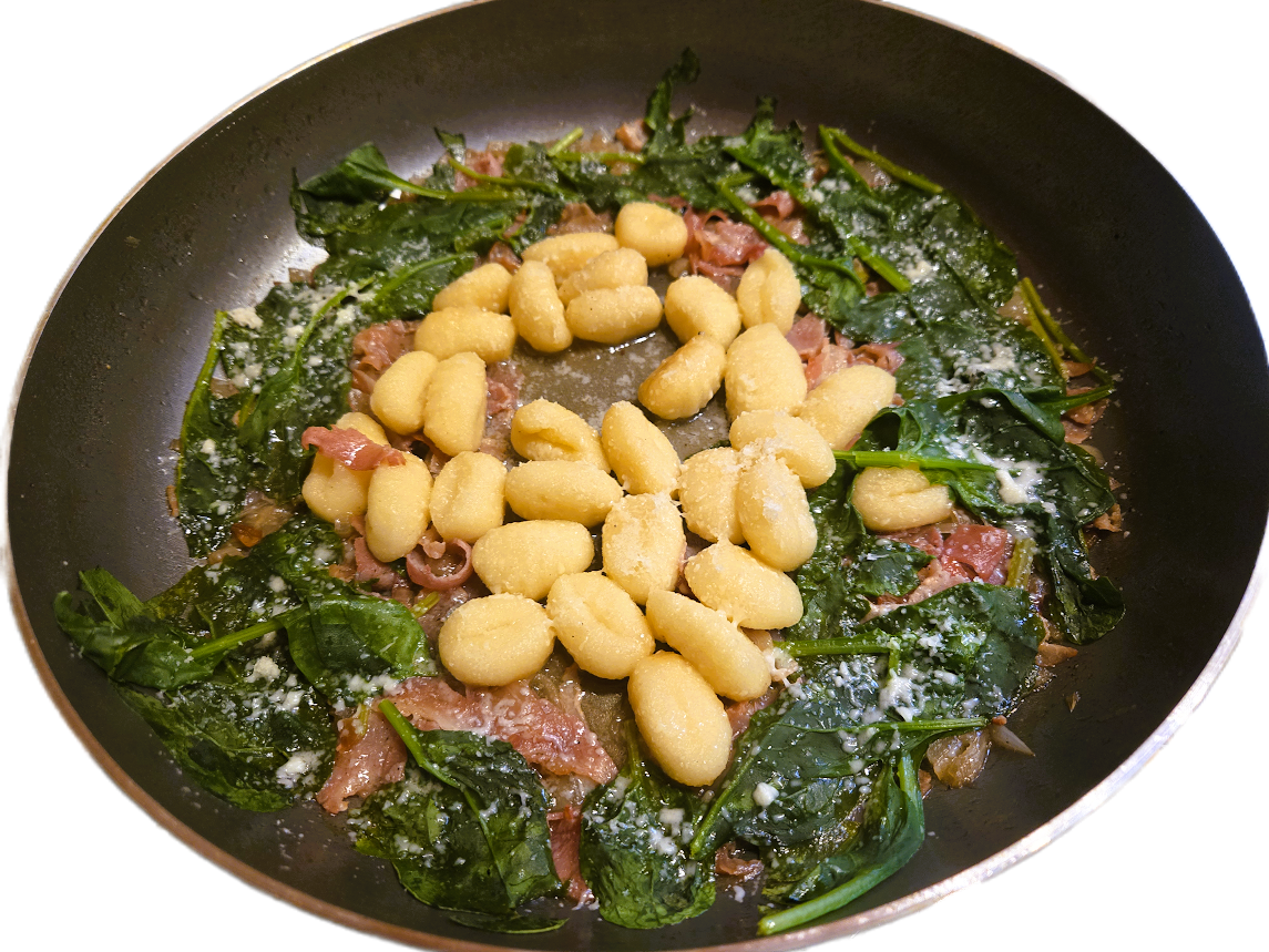 Gnocchi with bacon, shallot, spinach. Reduction of white wine and lite chicken broth. The gnocchi is the standard softish shelf product; though I freeze them in meal-size baggies when I get home. Directions are to throw the frozen ones into boiling water for a few minutes. I decided to see if I could steam them in the same pan as the other ingredients, rather than dirty another pot. After the bacon, shallots were done, I did my reduction in the pan. Then added both the fresh spinach and the gnocchi. Covered with a tight lid. Took about 4 minutes. Very happy with the outcome.