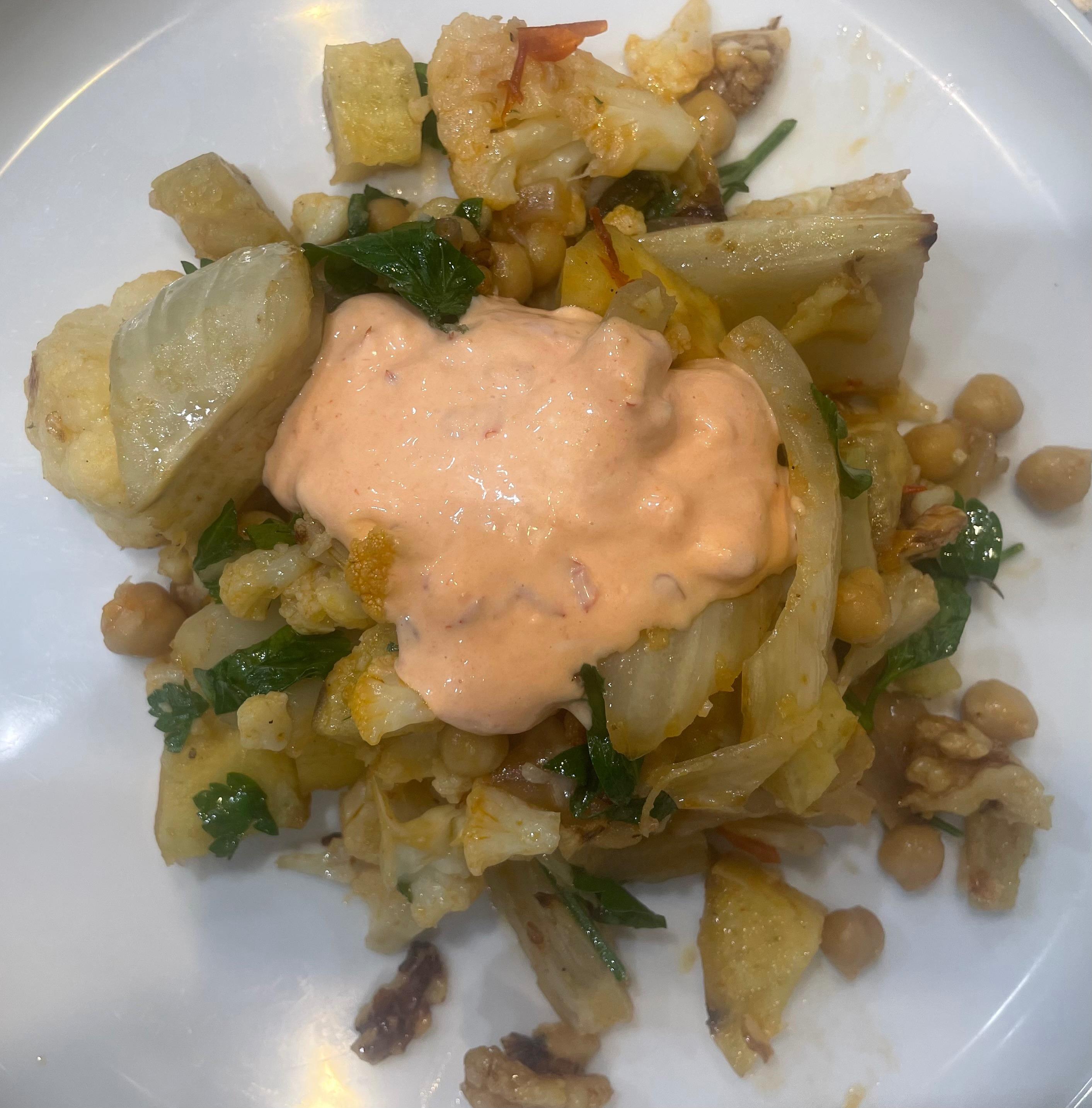 Roasted Fall Vegetables with Harissa Mayonnaise - fennel, cauliflower, sweet potatoes, red onions and chickpeas are oven roasted with an oil-harissa mix. Finished with fresh caramelized walnuts and parsley and served with harissa mayonnaise (mayonnaise, harissa, lemon juice)